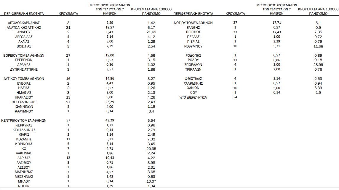 Με βάση τα επιβεβαιωμένα κρούσματα των τελευταίων 7 ημερών, 38 θεωρούνται σχετιζόμενα με ταξίδι από το εξωτερικό και 578 είναι σχετιζόμενα με ήδη γνωστό κρούσμα.