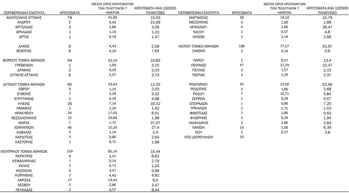 Με βάση τα επιβεβαιωμένα κρούσματα των τελευταίων 7 ημερών, 114 θεωρούνται σχετιζόμενα με ταξίδι από το εξωτερικό και 962 είναι σχετιζόμενα με ήδη γνωστό κρούσμα.