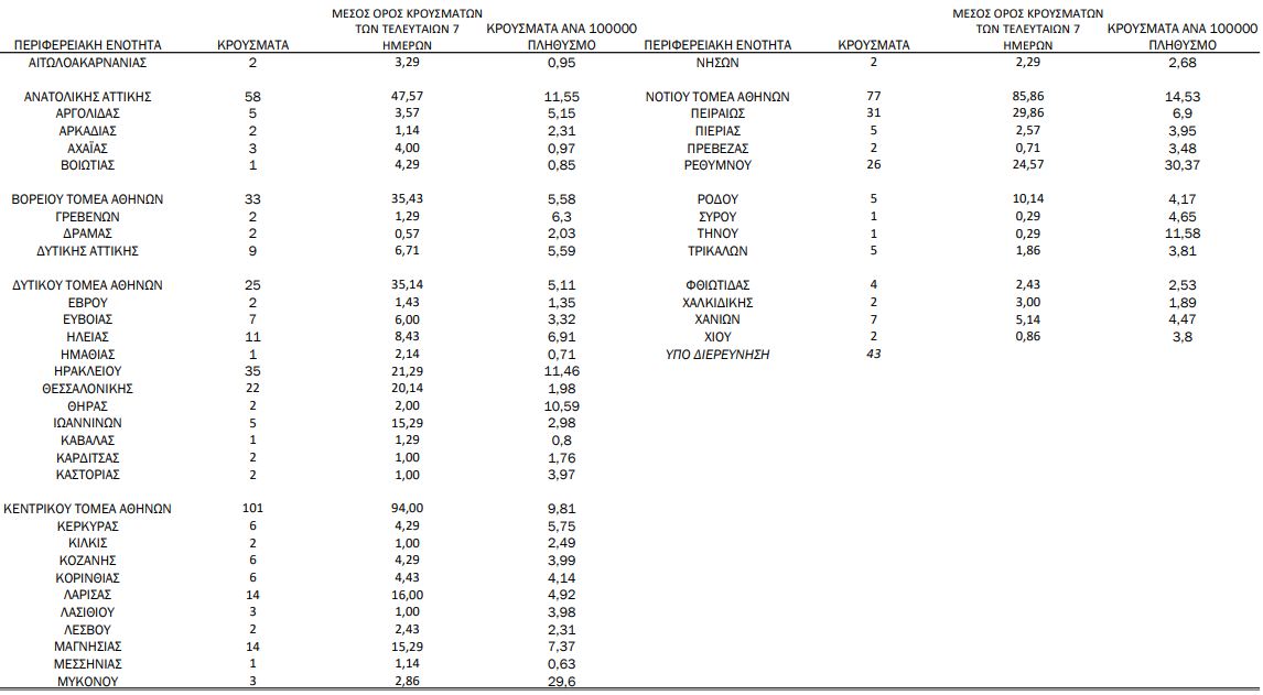 Με βάση τα επιβεβαιωμένα κρούσματα των τελευταίων 7 ημερών, 107 θεωρούνται σχετιζόμενα με ταξίδι από το εξωτερικό και 1.182 είναι σχετιζόμενα με ήδη γνωστό κρούσμα.