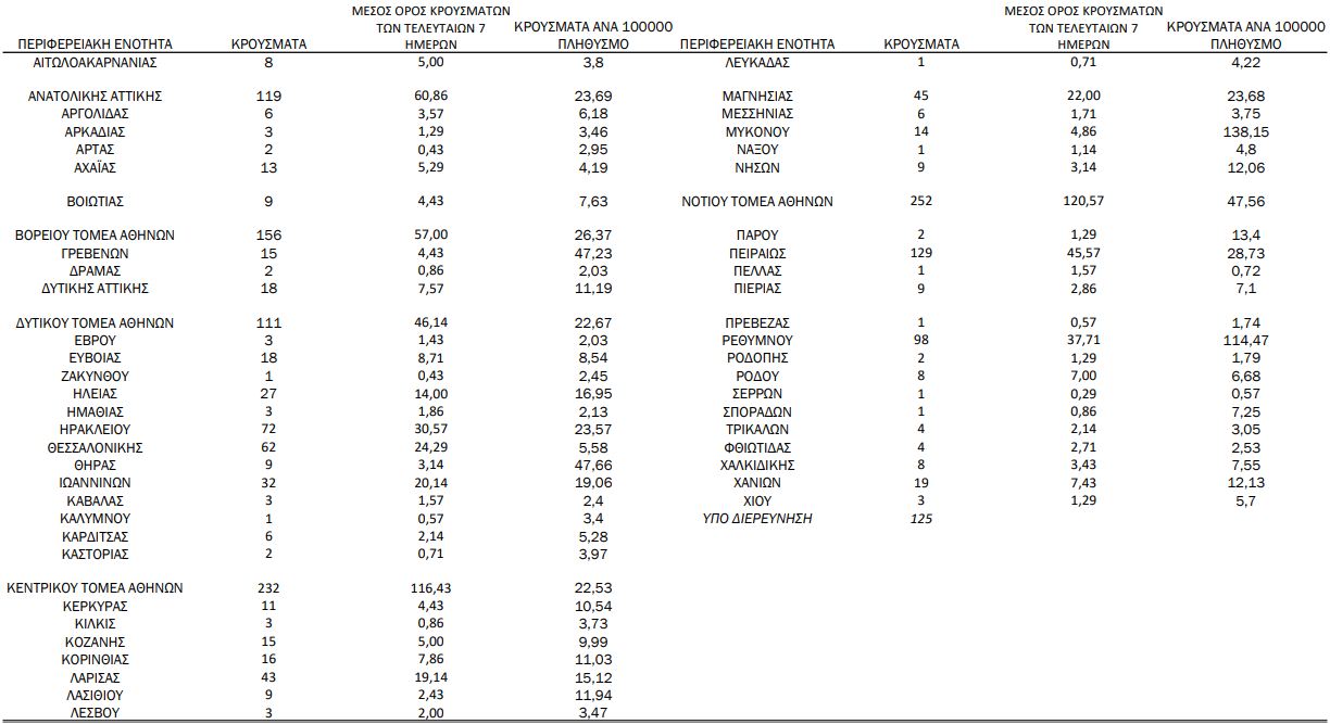 Με βάση τα επιβεβαιωμένα κρούσματα των τελευταίων 7 ημερών, 125 θεωρούνται σχετιζόμενα με ταξίδι από το εξωτερικό και 1.446 είναι σχετιζόμενα με ήδη γνωστό κρούσμα.
