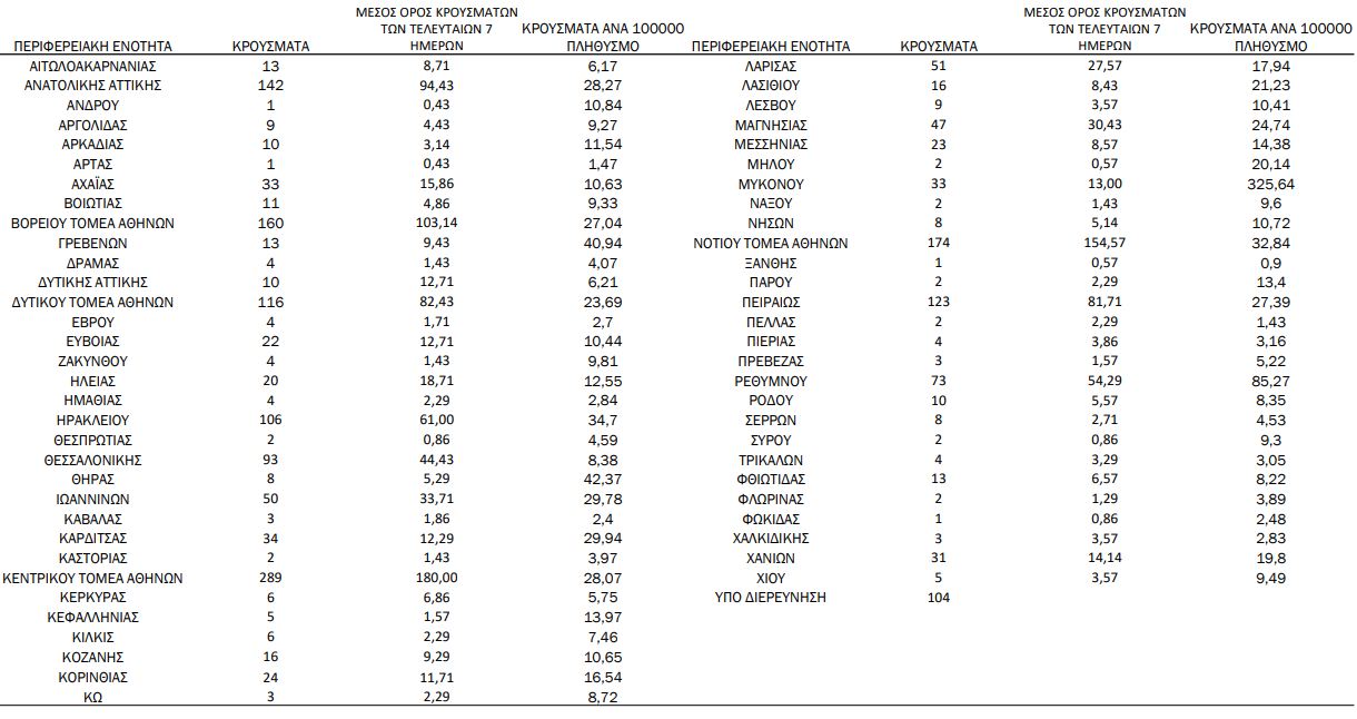 Με βάση τα επιβεβαιωμένα κρούσματα των τελευταίων 7 ημερών, 148 θεωρούνται σχετιζόμενα με ταξίδι από το εξωτερικό και 1.889 είναι σχετιζόμενα με ήδη γνωστό κρούσμα.