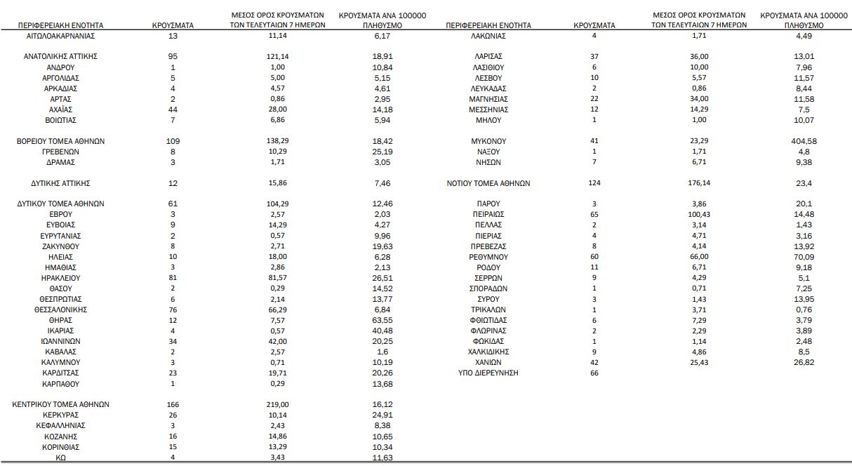 Με βάση τα επιβεβαιωμένα κρούσματα των τελευταίων 7 ημερών, 161 θεωρούνται σχετιζόμενα με ταξίδι από το εξωτερικό και 1.966 είναι σχετιζόμενα με ήδη γνωστό κρούσμα.