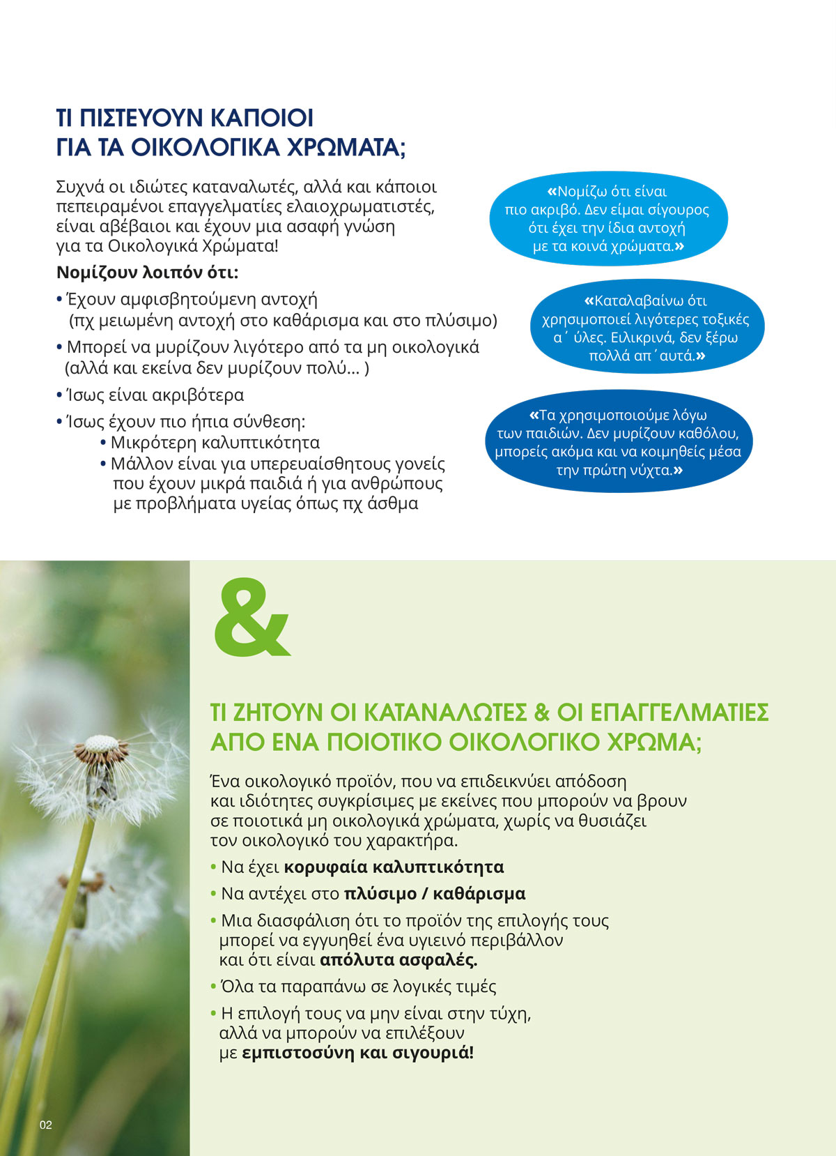 Είναι απολύτως ασφαλές, συμβάλλει στην καλύτερη ποιότητα εσωτερικού αέρα (French VOC Regulation A+) και είναι ιδανικό για χώρους που κατοικούνται. Διακρίνεται για την ασύγκριτη καλυπτικότητα και απόδοση, την υψηλή του λευκότητα και τις αναλλοίωτες αποχρώσεις, και έχει εξαιρετική αντοχή στο συχνό πλύσιμο (Class 1, EN 13300). Εφαρμόζεται σε σοβά, μπετόν, τούβλα, ξύλα. Δουλεύεται εύκολα, έχει ισχυρή πρόσφυση και γρήγορο στέγνωμα. Απλώνει θαυμάσια και δημιουργεί εξαιρετικό μάτ φινίρισμα. Εμποδίζει την ανάπτυξη της φωτιάς και την εξάπλωση της φλόγας.