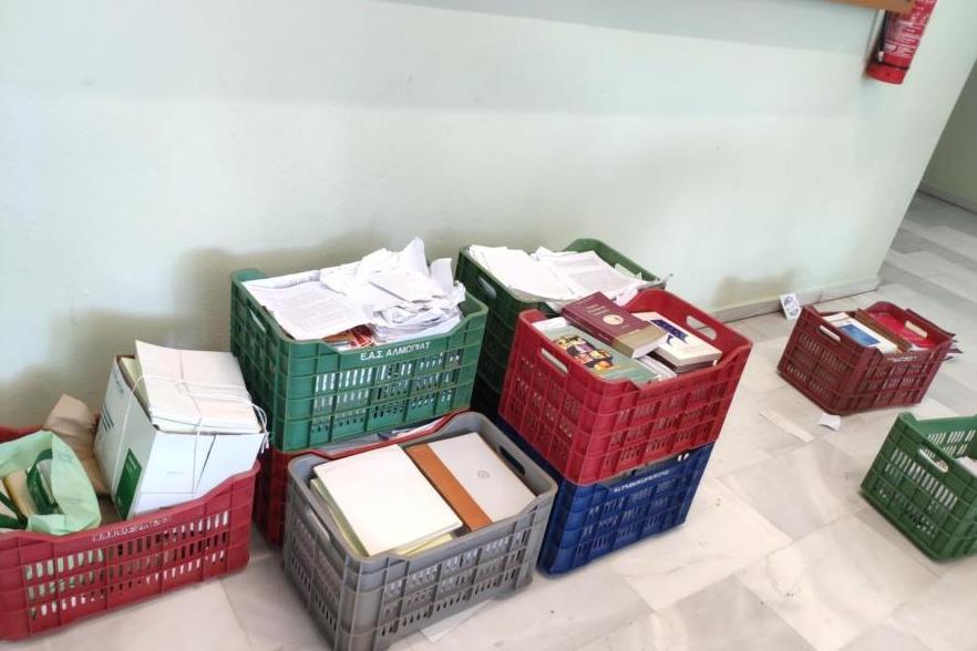 Βιβλία και χαρτί τακτοποιούνται σε πλαστικές κλούβες