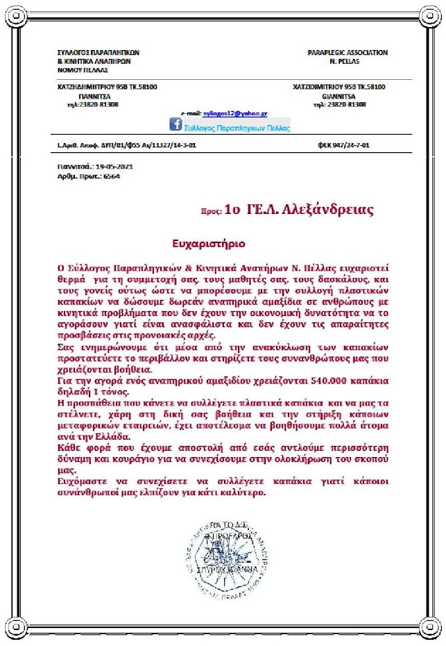 Ευχαριστήριο του Συλλόγου Παραπληγικών και Κινητικά Αναπήρων προς το 1ο Γενικό Λύκειο Αλεξάνδρειας