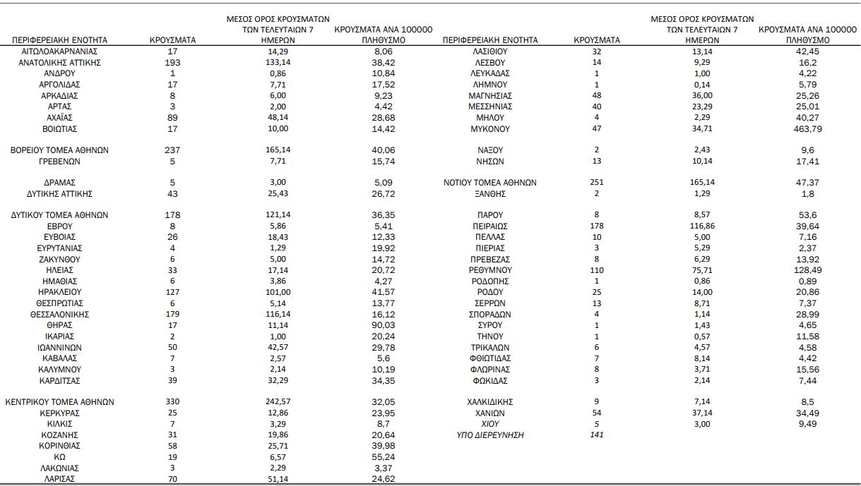 Με βάση τα επιβεβαιωμένα κρούσματα των τελευταίων 7 ημερών, 165 θεωρούνται σχετιζόμενα με ταξίδι από το εξωτερικό και 1.832 είναι σχετιζόμενα με ήδη γνωστό κρούσμα.