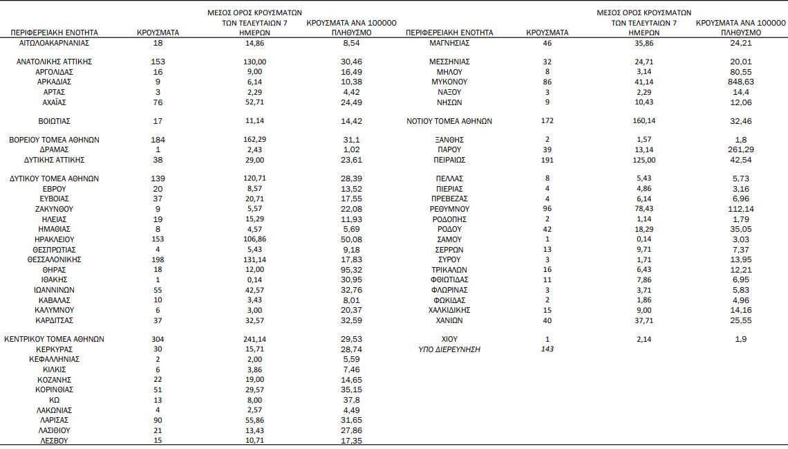 Με βάση τα επιβεβαιωμένα κρούσματα των τελευταίων 7 ημερών, 159 θεωρούνται σχετιζόμενα με ταξίδι από το εξωτερικό και 1.633 είναι σχετιζόμενα με ήδη γνωστό κρούσμα.