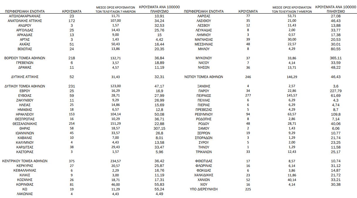Με βάση τα επιβεβαιωμένα κρούσματα των τελευταίων 7 ημερών, 123 θεωρούνται σχετιζόμενα με ταξίδι από το εξωτερικό και 1.318 είναι σχετιζόμενα με ήδη γνωστό κρούσμα.