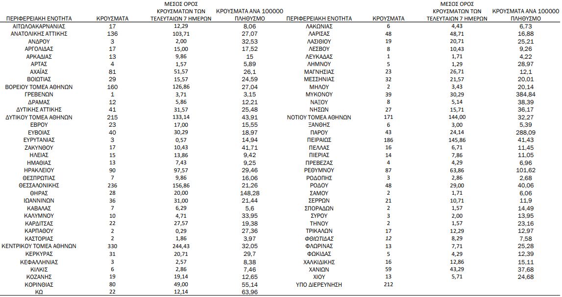 Με βάση τα επιβεβαιωμένα κρούσματα των τελευταίων 7 ημερών, 131 θεωρούνται σχετιζόμενα με ταξίδι από το εξωτερικό και 1.275 είναι σχετιζόμενα με ήδη γνωστό κρούσμα.