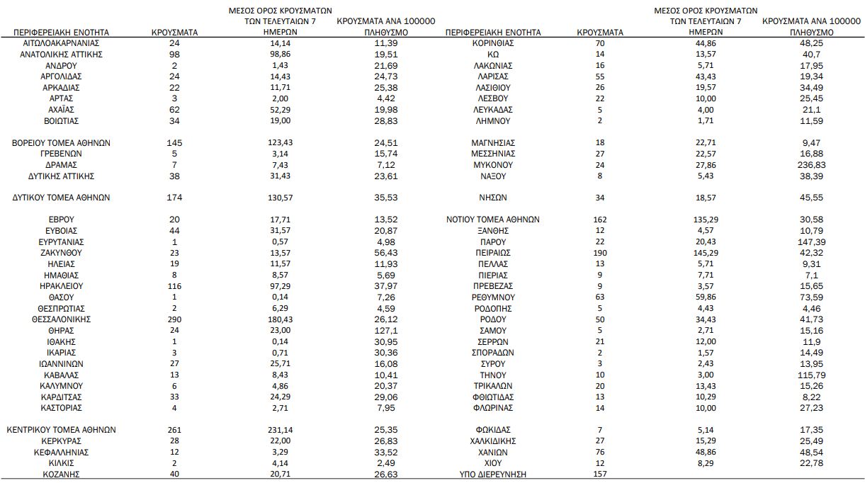 Με βάση τα επιβεβαιωμένα κρούσματα των τελευταίων 7 ημερών, 130 θεωρούνται σχετιζόμενα με ταξίδι από το εξωτερικό και 1.394 είναι σχετιζόμενα με ήδη γνωστό κρούσμα.