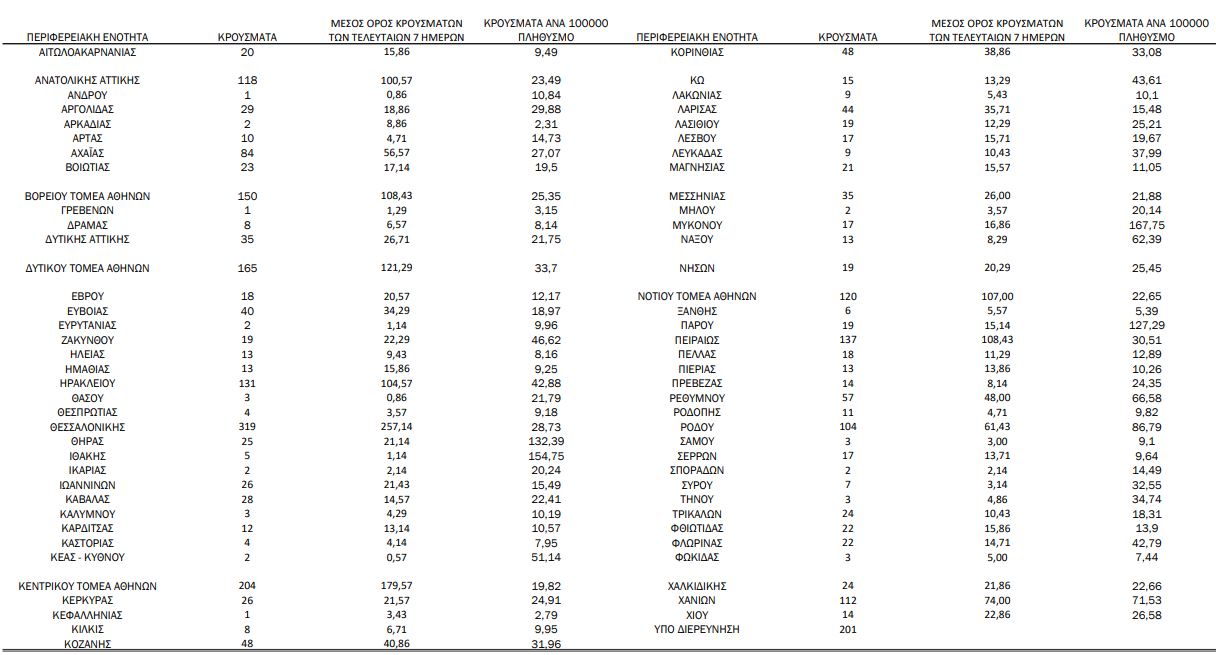 Με βάση τα επιβεβαιωμένα κρούσματα των τελευταίων 7 ημερών, 134 θεωρούνται σχετιζόμενα με ταξίδι από το εξωτερικό και 1.812 είναι σχετιζόμενα με ήδη γνωστό κρούσμα.