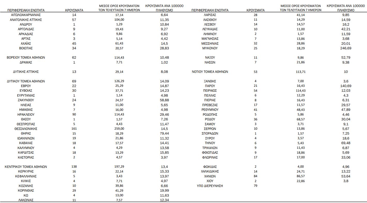 Με βάση τα επιβεβαιωμένα κρούσματα των τελευταίων 7 ημερών, 155 θεωρούνται σχετιζόμενα με ταξίδι από το εξωτερικό και 1.806 είναι σχετιζόμενα με ήδη γνωστό κρούσμα.