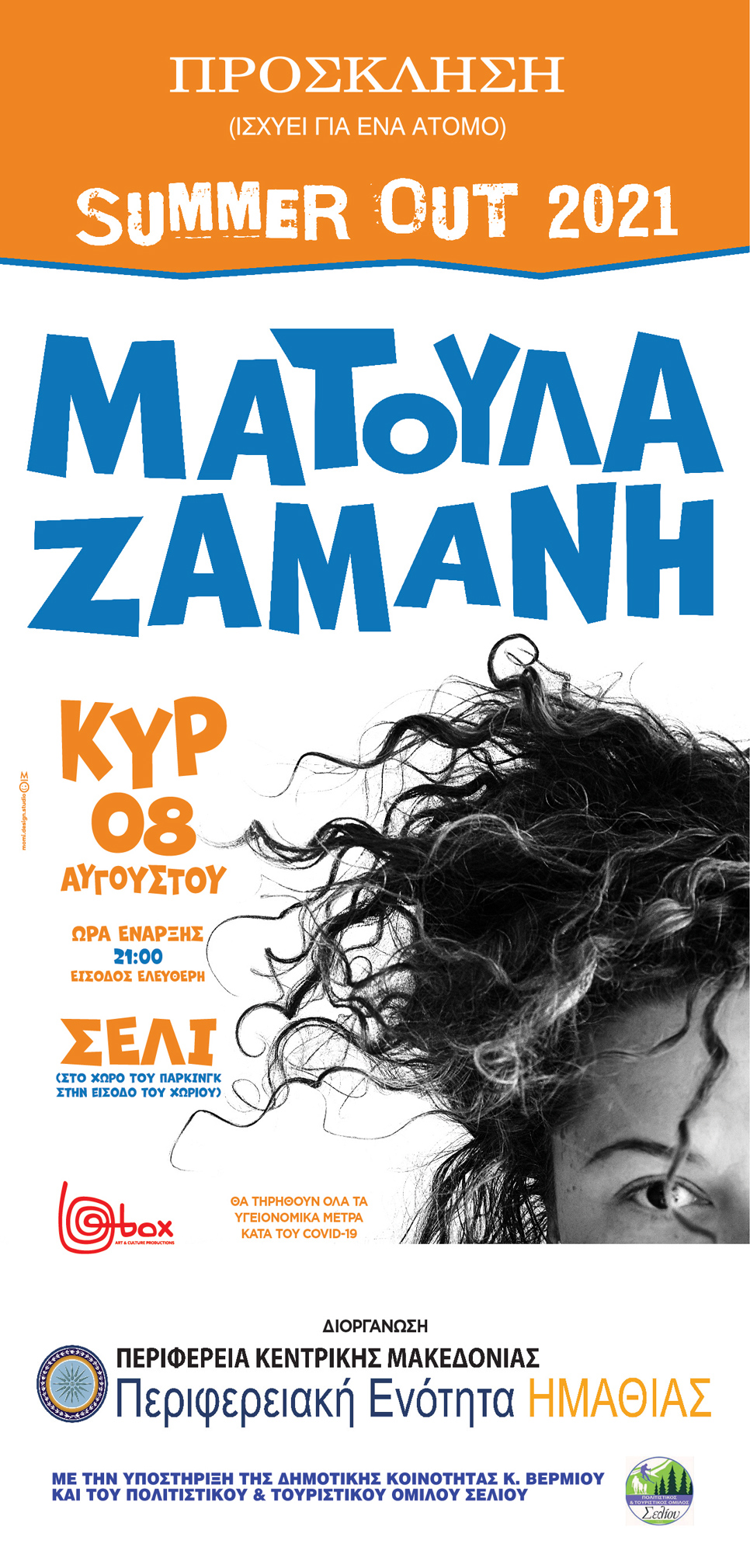 Η Π.Ε Ημαθίας, στα πλαίσια του πρώτου SummerOut που θα διεξαχθεί την Κυριακή 8 Αυγούστου 2021 στο Σέλι, διοργανώνει μουσική συναυλία της Ματούλας Ζαμάνη.