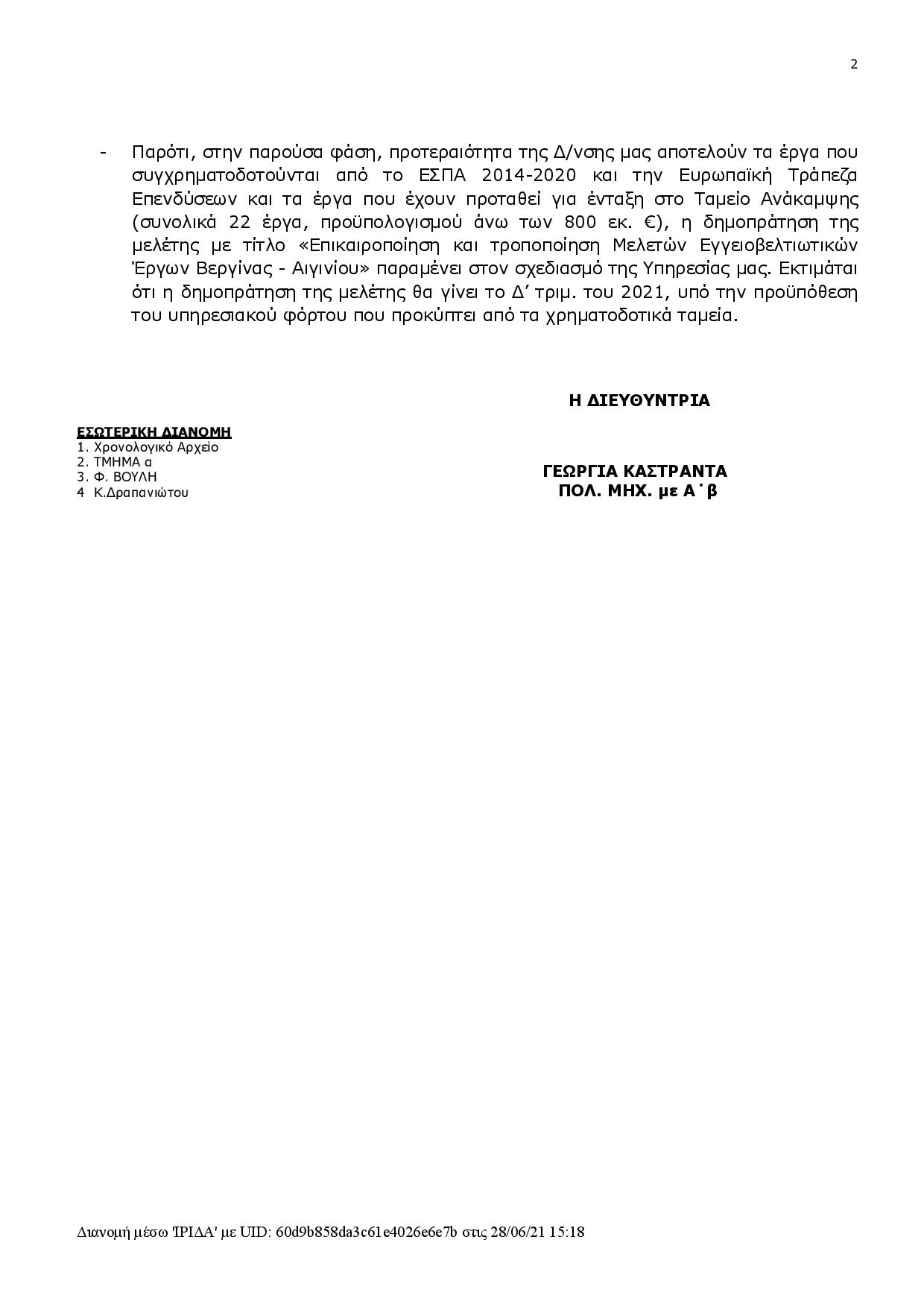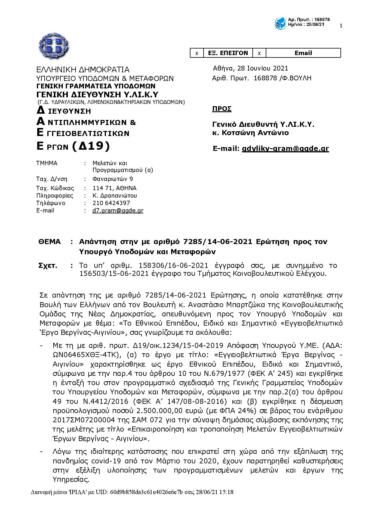 Τέλος του 2021 ξεκινάει η δημοπράτηση της μελέτης του μεγάλου αρδευτικού έργου «Βεργίνα-Μελίκη-Αιγίνιο», με επίσημη, έγγραφη απάντηση του Υπουργού Υποδομών, κ. Καραμανλή,προς τον Τάσο Μπαρτζώκα, ο οποίος με παρέμβασή του ανέδειξε εκ νέου το θέμα κατασκευής του έργου, φέρνοντας το ζήτημα στη Βουλή.