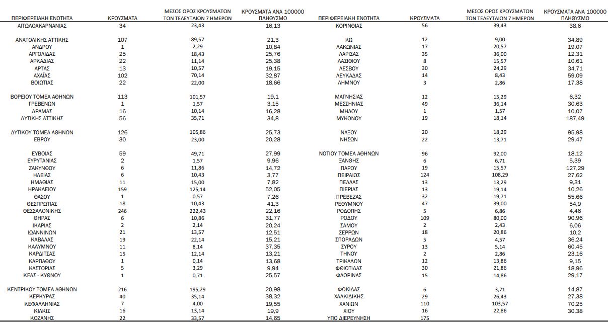 Με βάση τα επιβεβαιωμένα κρούσματα των τελευταίων 7 ημερών, 129 θεωρούνται σχετιζόμενα με ταξίδι από το εξωτερικό και 2.185 είναι σχετιζόμενα με ήδη γνωστό κρούσμα.