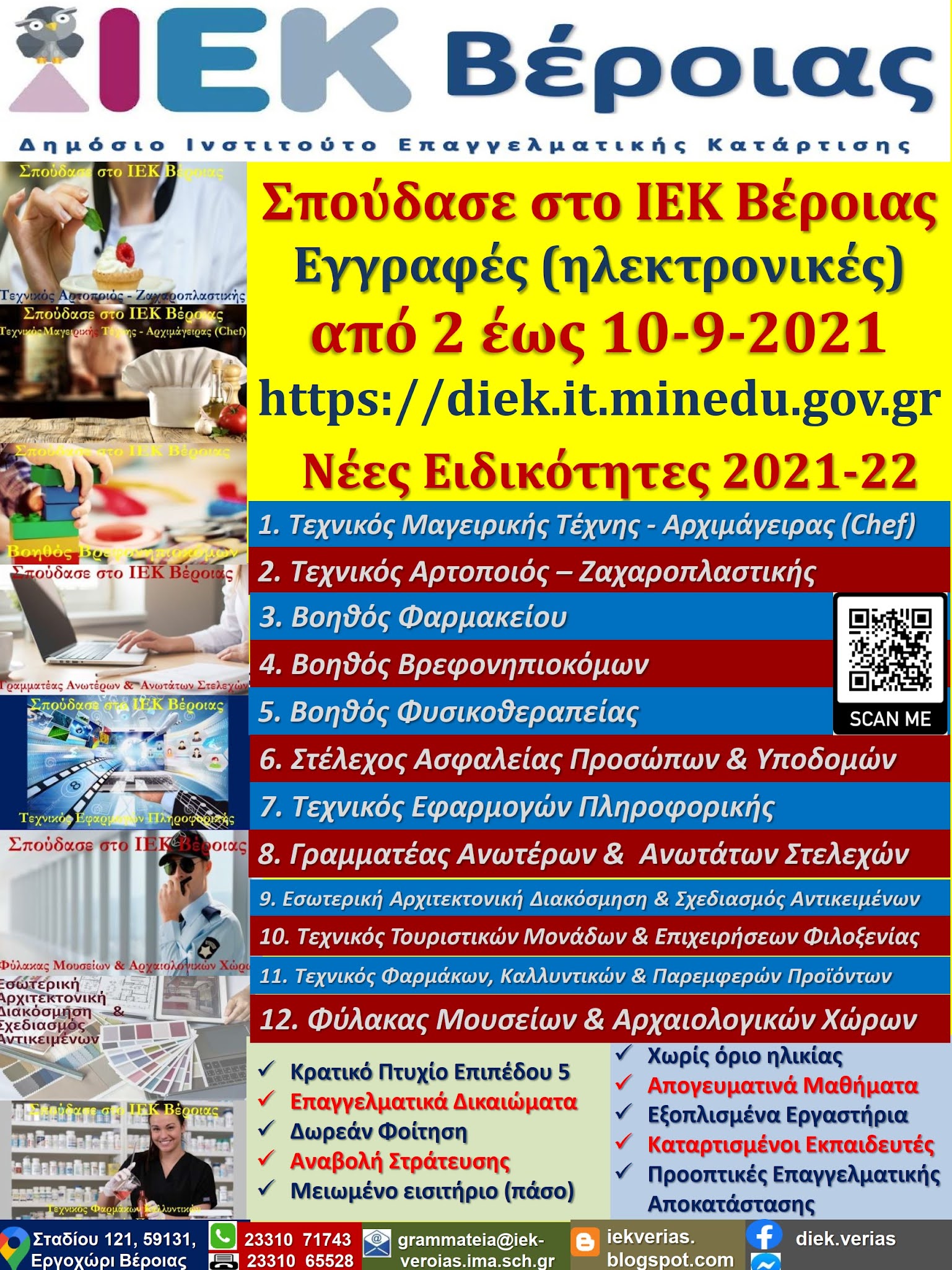 Το Δημόσιο ΙΕΚ Βέροιας καλεί τους αποφοίτους Γενικού Λυκείου & ΕΠΑΛ (Πτυχίο ΤΕΕ Β’ Κύκλου, Πτυχίο ΤΕΛ) χωρίς όριο ηλικίας.
