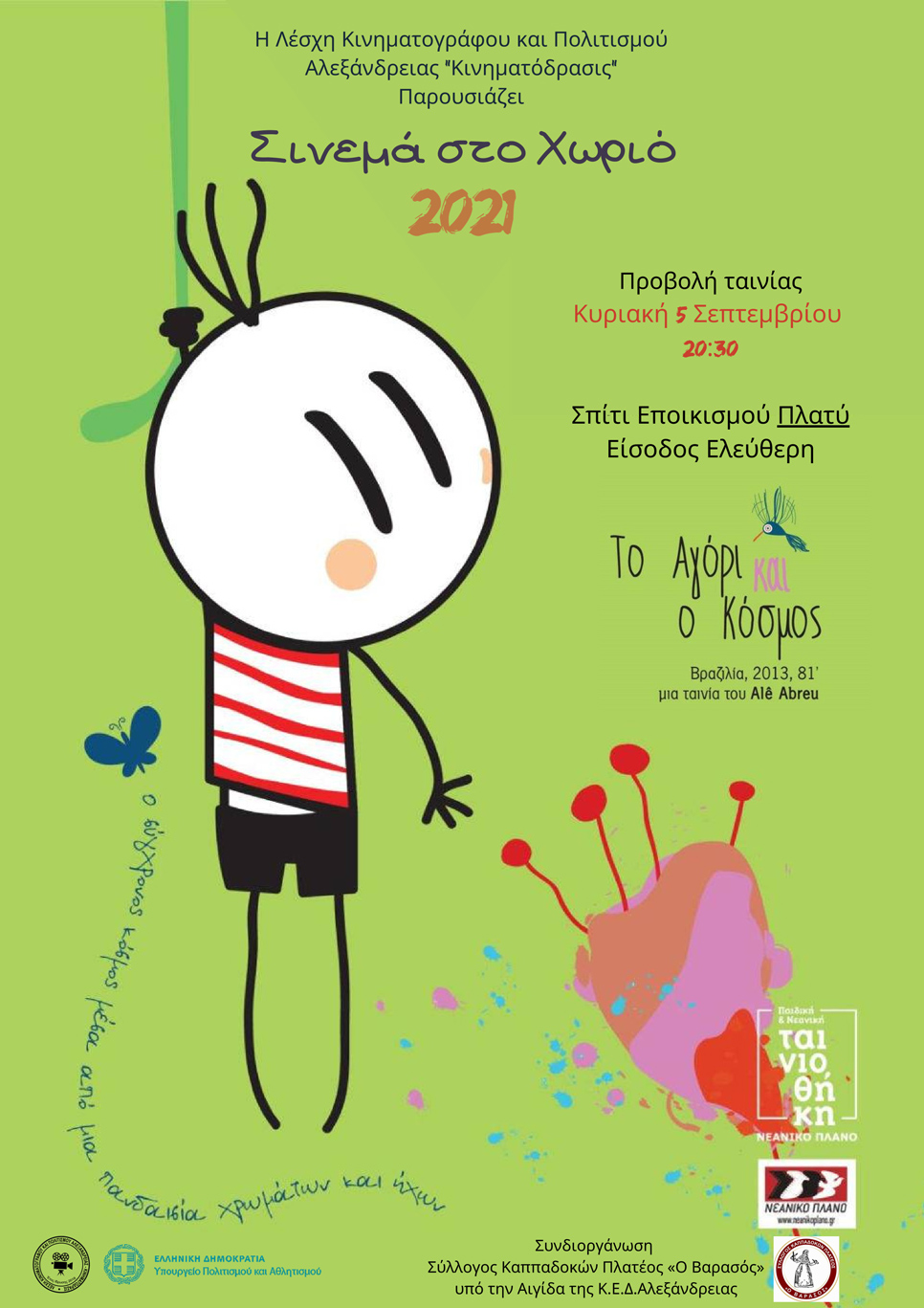 Το 1ο Σινεμά στο Χωριό αφορά δύο προβολές εξαιρετικών παιδικών ταινιών από την εγκεκριμένη από το ΙΕΠ (Ινστιτούτο Εκπαιδευτικής Πολιτικής) Παιδική και Νεανική Ταινιοθήκη του Νεανικού Πλάνου πέρα από τα συνηθισμένα πρότυπα των blockbusters και του Hollywood ενώ ευελπιστούμε πως του χρόνου υπό καλύτερες συνθήκες το πρόγραμμα μας θα μεγαλώσει και θα εμπλουτιστεί με ταινίες για όλες τις ηλικίες, θεματικές, ντοκιμαντέρ και πολλές εκπλήξεις.