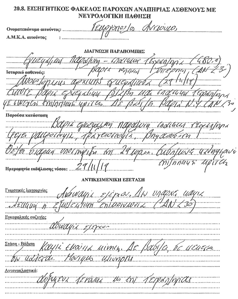 Κατόπιν πλήρους ενημέρωσης από τον θεράποντα γιατρό του και μέσα από επίσημα έγγραφα που πιστοποιούν την σοβαρή του κατάσταση, χρήζει συστηματικών και συνεχών φυσικοθεραπειών για βελτίωση-πρόληψη μόνιμων συγκάμψεων αρθρώσεων και ενδυνάμωσης μυϊκών ομάδων.