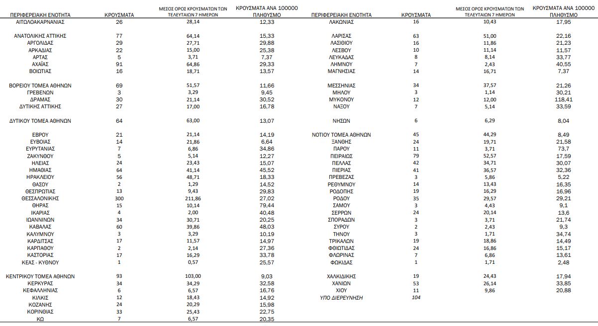 Με βάση τα επιβεβαιωμένα κρούσματα των τελευταίων 7 ημερών, 185 θεωρούνται σχετιζόμενα με ταξίδι από το εξωτερικό και 2.526 είναι σχετιζόμενα με ήδη γνωστό κρούσμα.