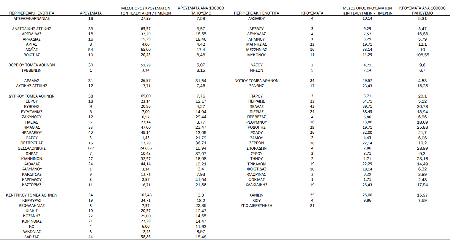 Ο συνολικός αριθμός των κρουσμάτων ανέρχεται σε 615.157 (ημερήσια μεταβολή +0.2%), εκ των οποίων 51.0% άνδρες. Με βάση τα επιβεβαιωμένα κρούσματα των τελευταίων 7 ημερών, 188 θεωρούνται σχετιζόμενα με ταξίδι από το εξωτερικό και 3.002 είναι σχετιζόμενα με ήδη γνωστό κρούσμα.