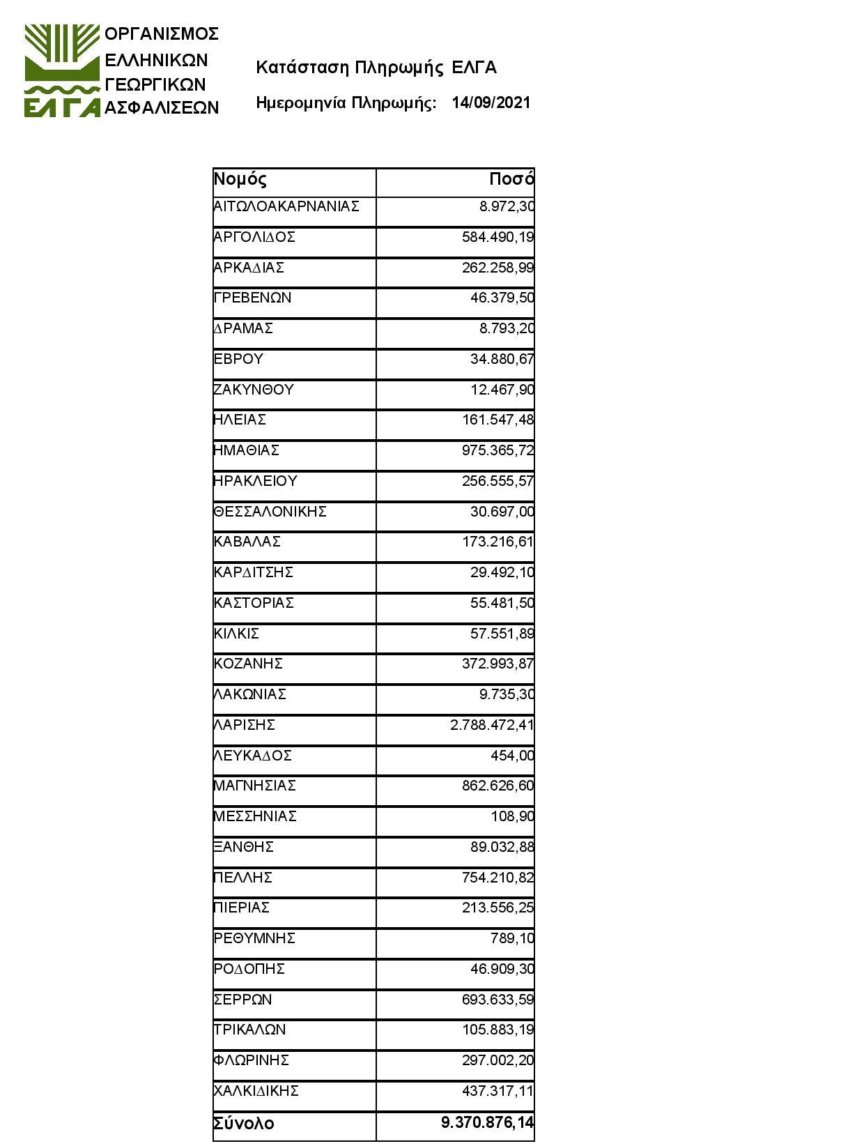 Σήμερα Τρίτη 14 Σεπτεμβρίου 2021, καταβάλλονται από τον ΕΛ.Γ.Α. πληρωμές προκαταβολών ύψους 9.370.876,14 ευρώ σε 7.910 δικαιούχους αγρότες.