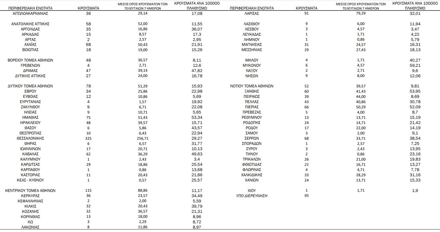 Με βάση τα επιβεβαιωμένα κρούσματα των τελευταίων 7 ημερών, 99 θεωρούνται σχετιζόμενα με ταξίδι από το εξωτερικό και 3.203 είναι σχετιζόμενα με ήδη γνωστό κρούσμα.