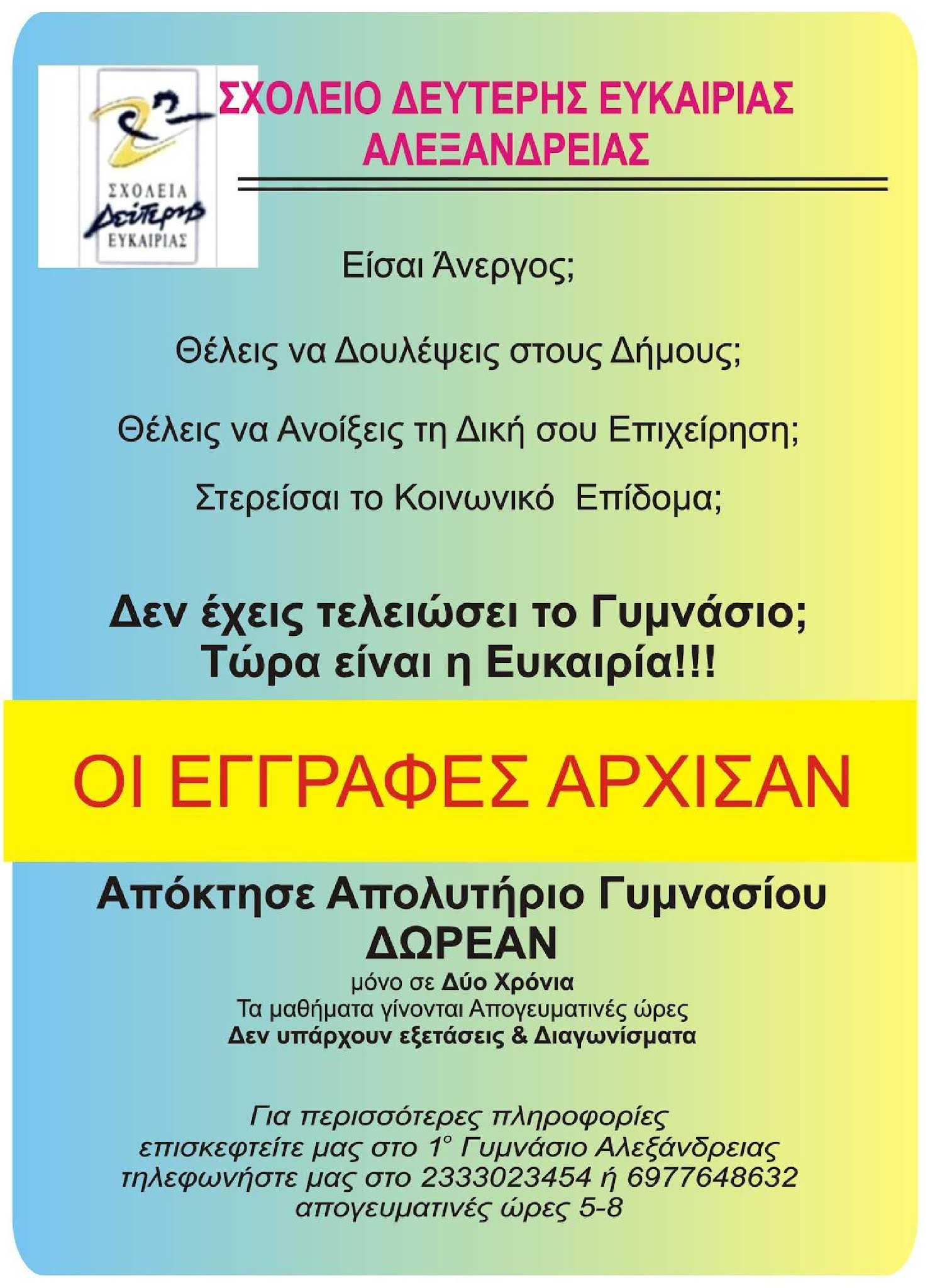 Εγγραφές στο Σχολείο Δεύτερης Ευκαιρίας στην Αλεξάνδρεια