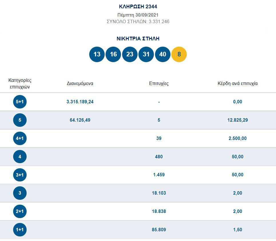 Οι αριθμοί που κληρώθηκαν είναι: 13, 16, 23, 31 και 40. Αριθμός Τζόκερ το 8