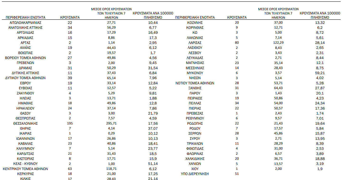 Με βάση τα επιβεβαιωμένα κρούσματα των τελευταίων 7 ημερών, 85 θεωρούνται σχετιζόμενα με ταξίδι από το εξωτερικό και 3.228 είναι σχετιζόμενα με ήδη γνωστό κρούσμα.