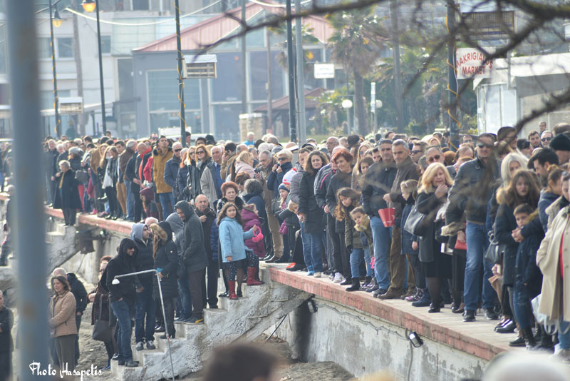 Πλήθος κόσμου από όλη την περιοχή παρακολούθησε την τελετή καθαγιασμού των υδάτων στο Μακρύγιαλο Πιερίας, στην παραλία του χωριού, με τα καπνογόνα να δίνουν κλίμα.