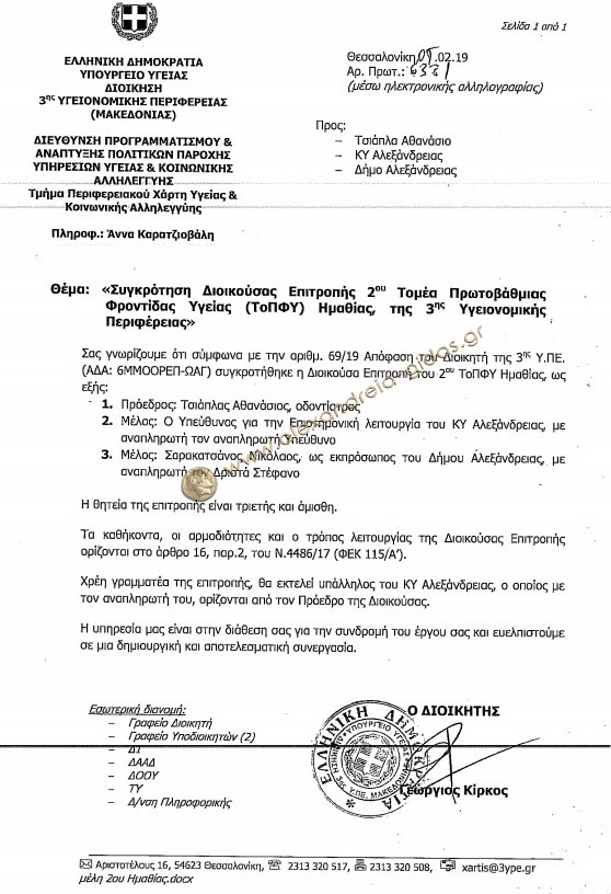 Με απόφαση του Διοικητή της 3ης Υ. ΠΕ (Υγειονομικής Περιφέρειας) συγκροτήθηκε η Διοικούσα Επιτροπή του 2ου ΤοΠΦΥ (Τομέας Πρωτοβάθμιας Φροντίδας Υγείας).
