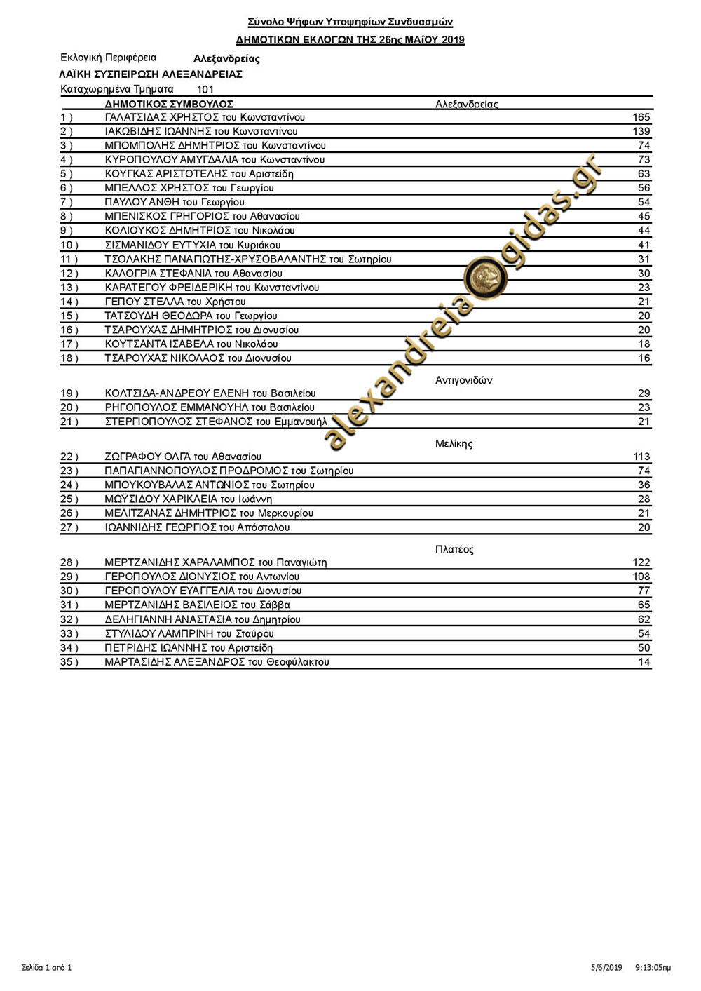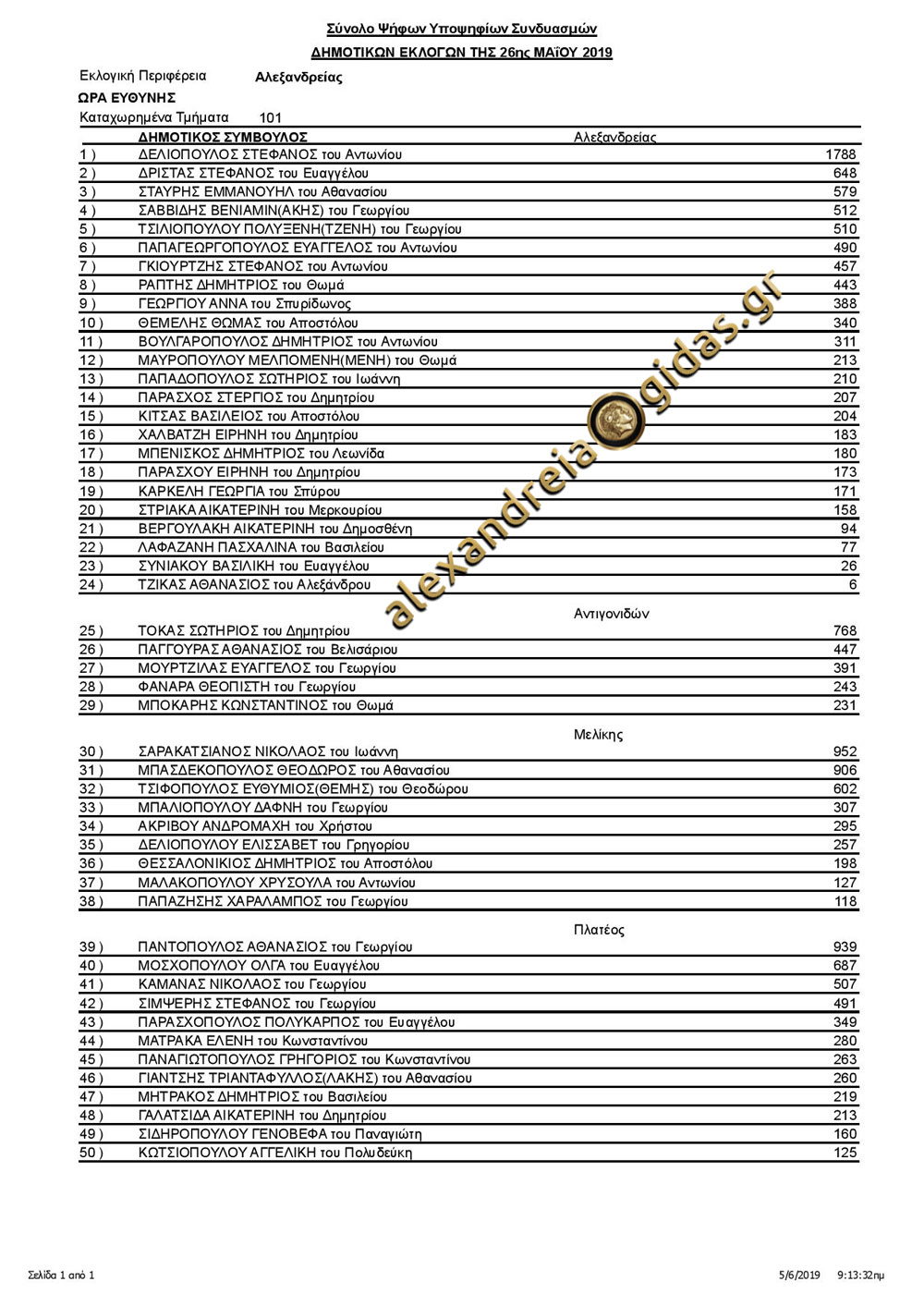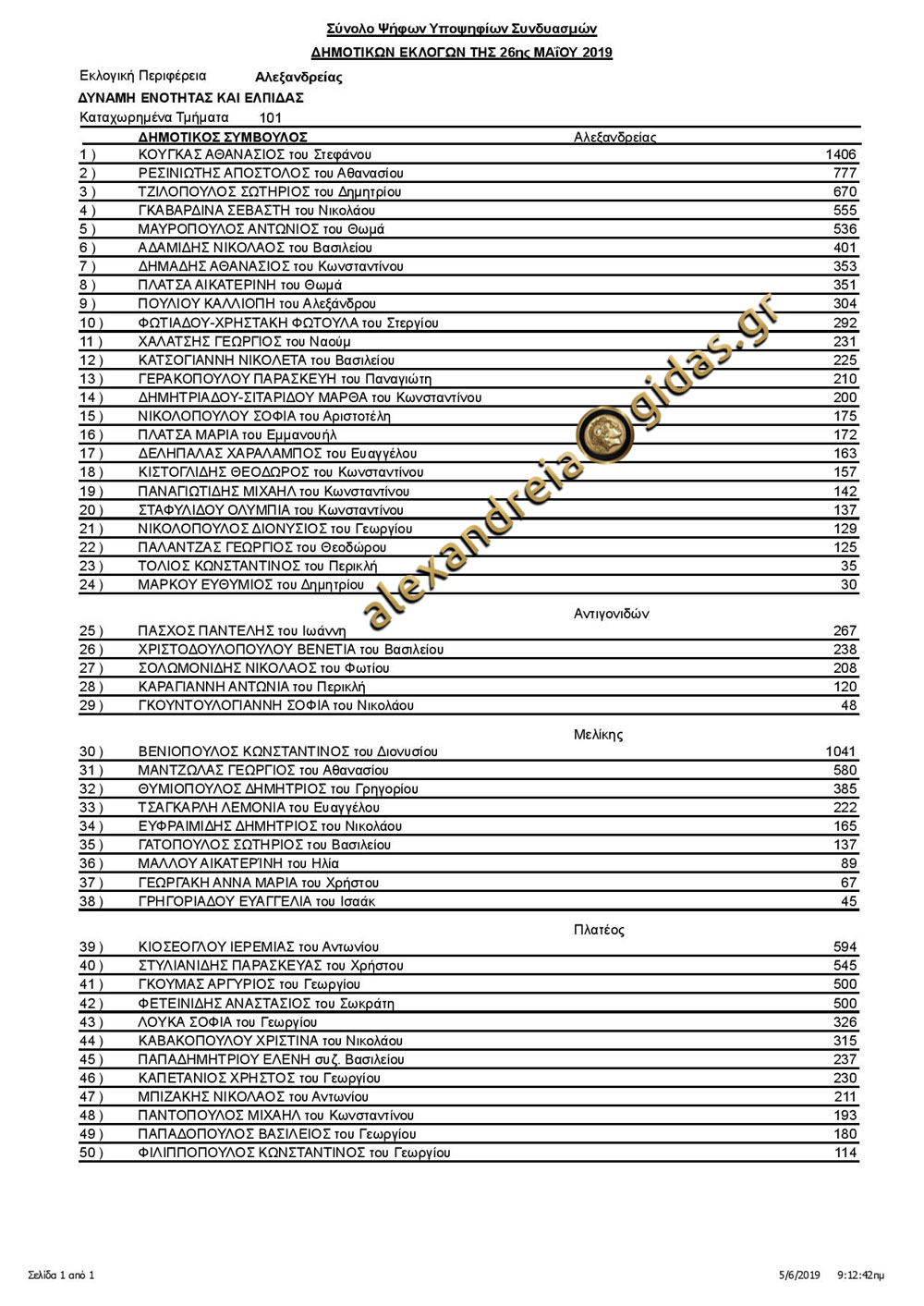 Δείτε παρακάτω τα ΕΠΙΣΗΜΑ αποτελέσματα των πέντε συνδυασμών του δήμου Αλεξάνδρειας: