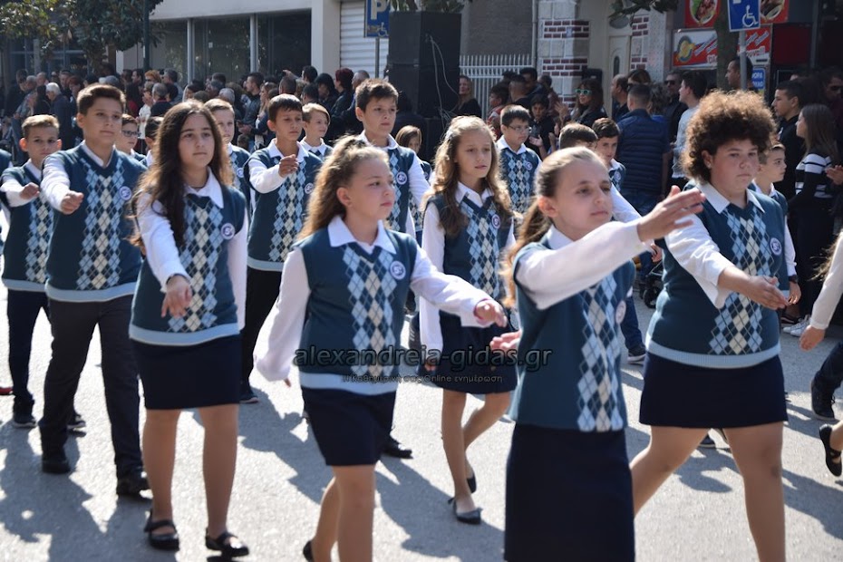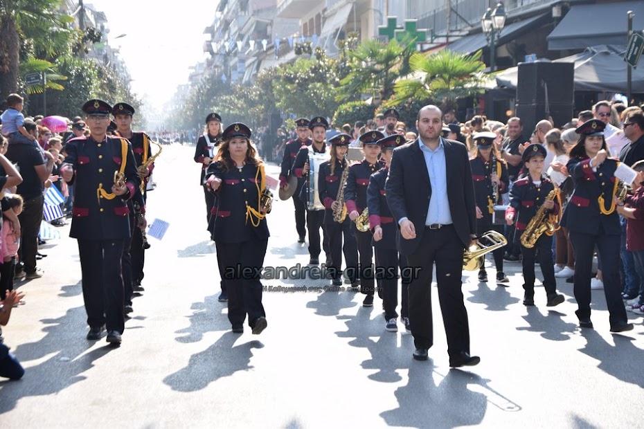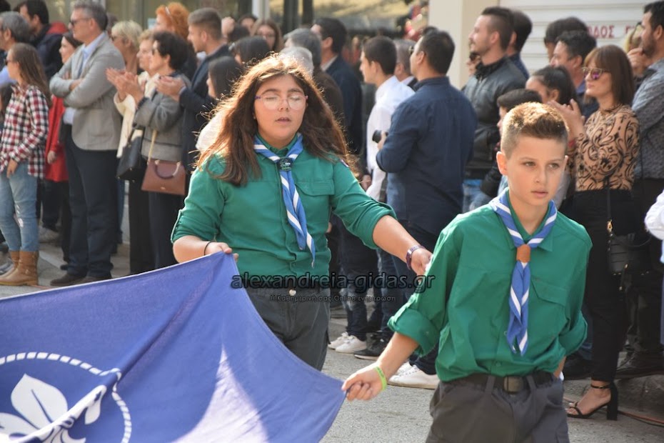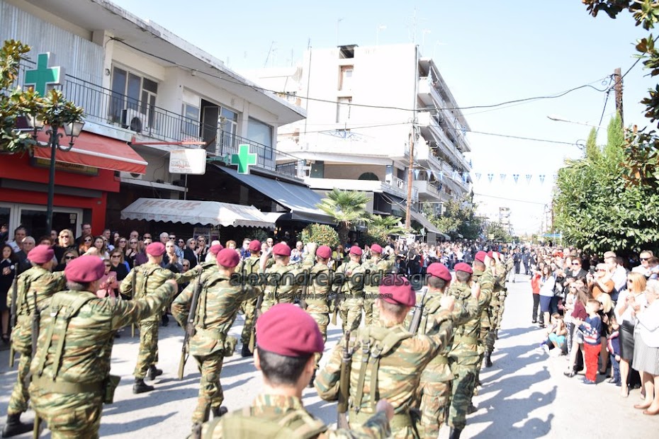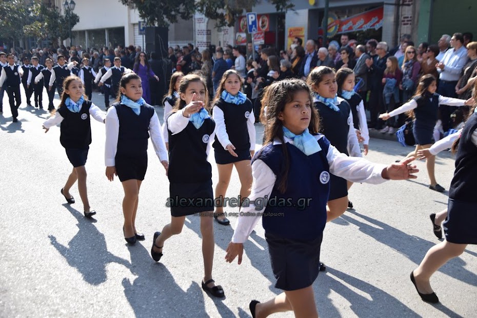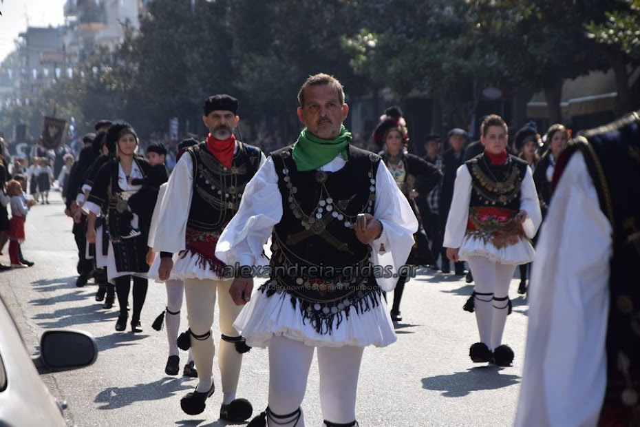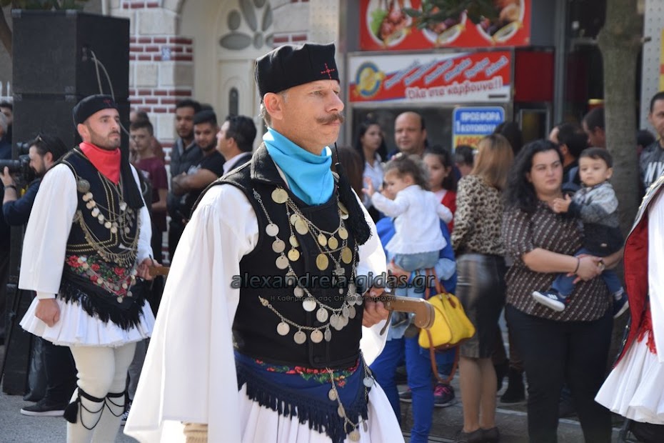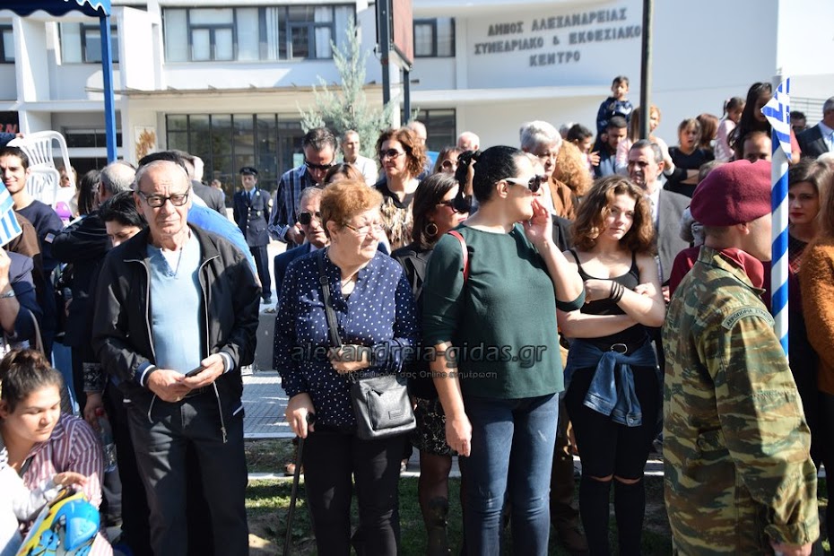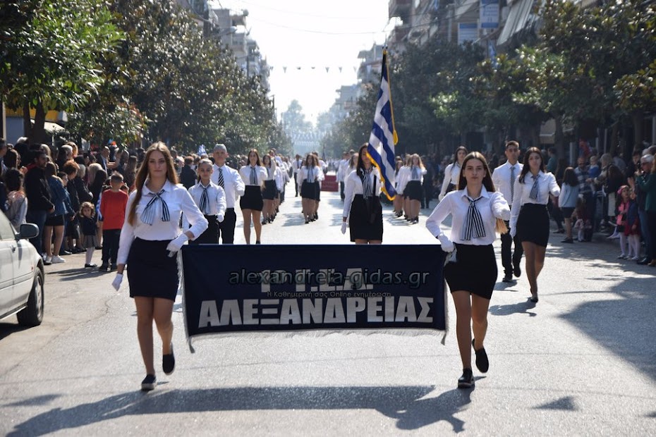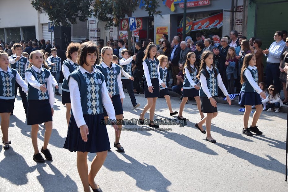 Το θερμό χειροκρότημα του κόσμου που συγκεντρώθηκε στο κέντρο της πόλης απέσπασαν τα σχολεία, οι πολιτιστικοί και αθλητικοί σύλλογοι, οι Πρόσκοποι Αλεξάνδρειας και ο στρατός που παρέλασαν στην Βετσοπούλου.