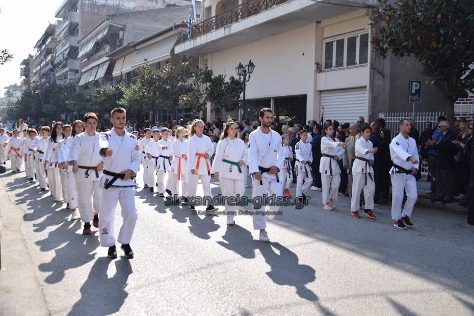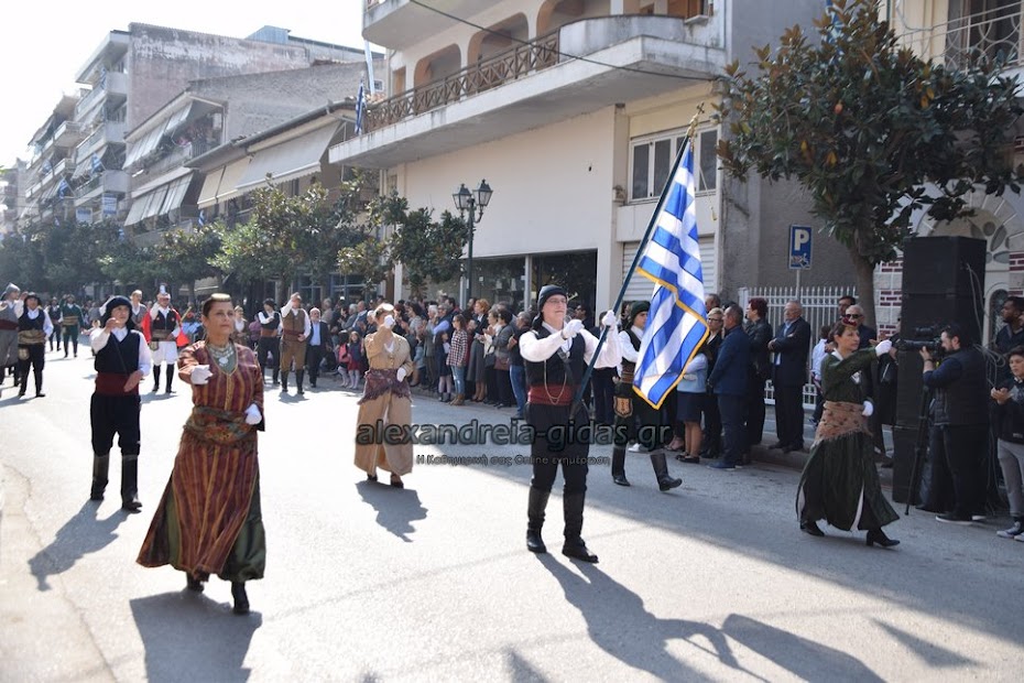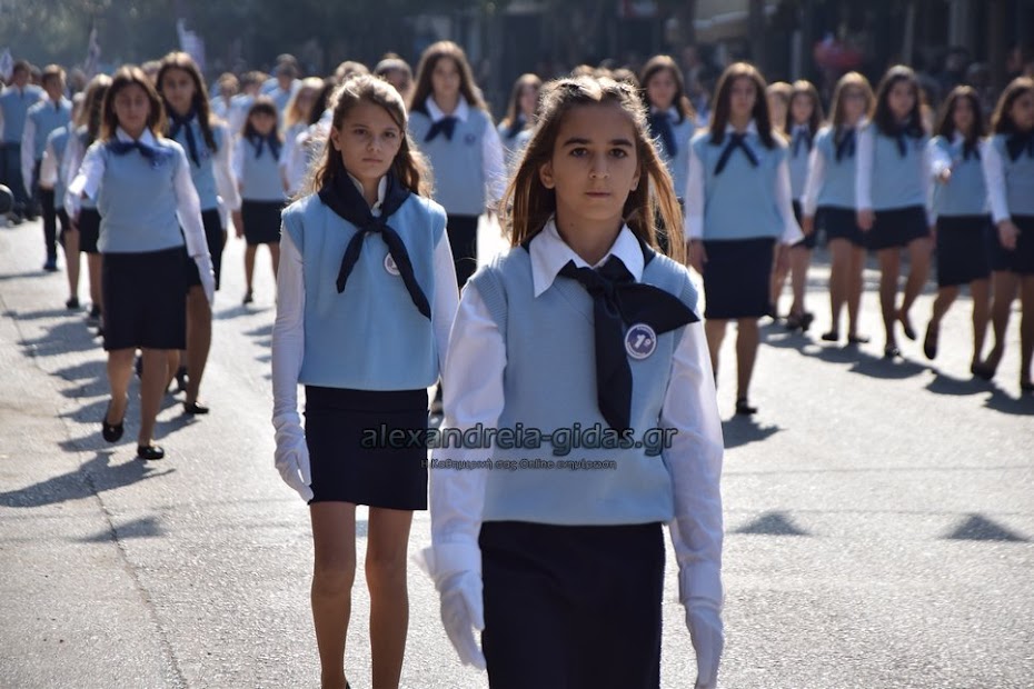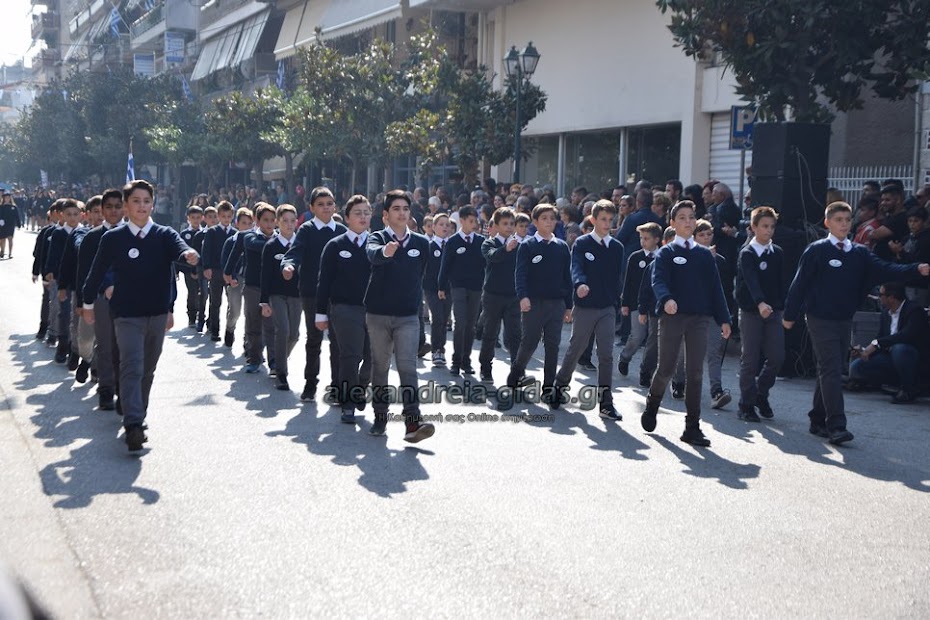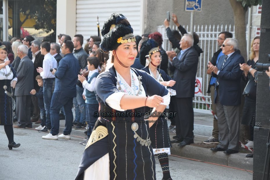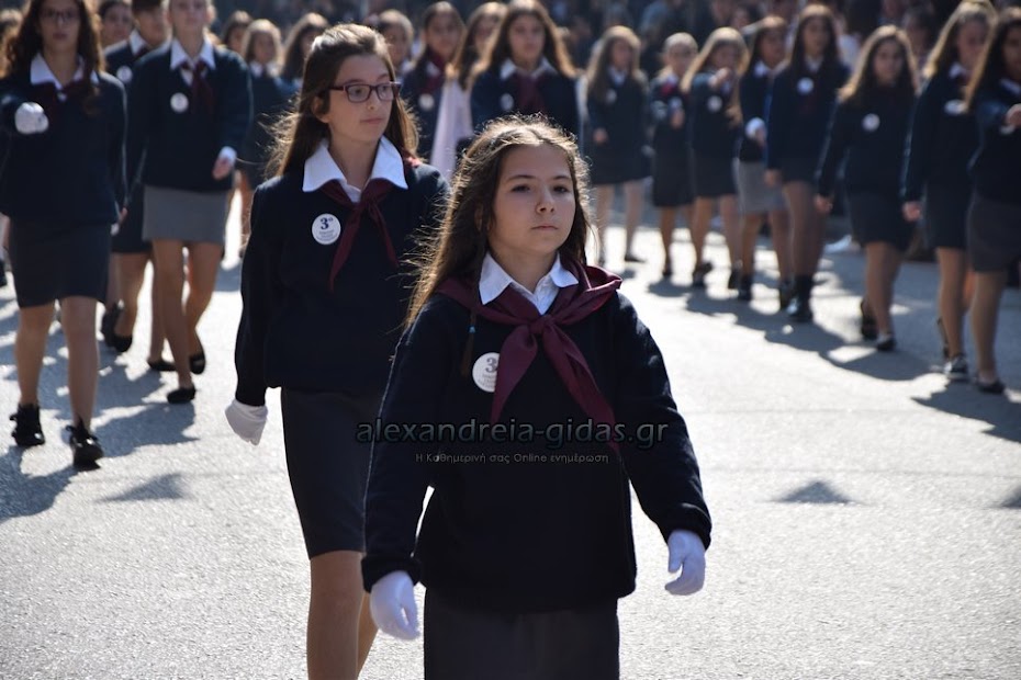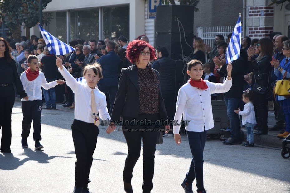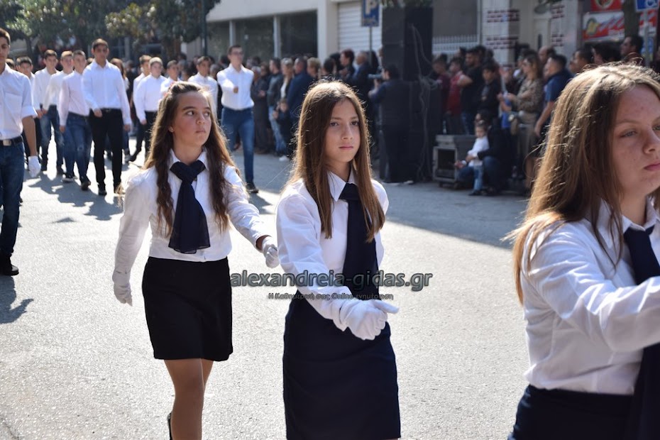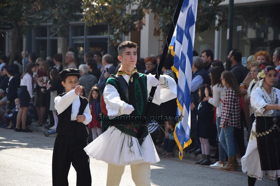 Το θερμό χειροκρότημα του κόσμου που συγκεντρώθηκε στο κέντρο της πόλης απέσπασαν τα σχολεία, οι πολιτιστικοί και αθλητικοί σύλλογοι, οι Πρόσκοποι Αλεξάνδρειας και ο στρατός που παρέλασαν στην Βετσοπούλου.