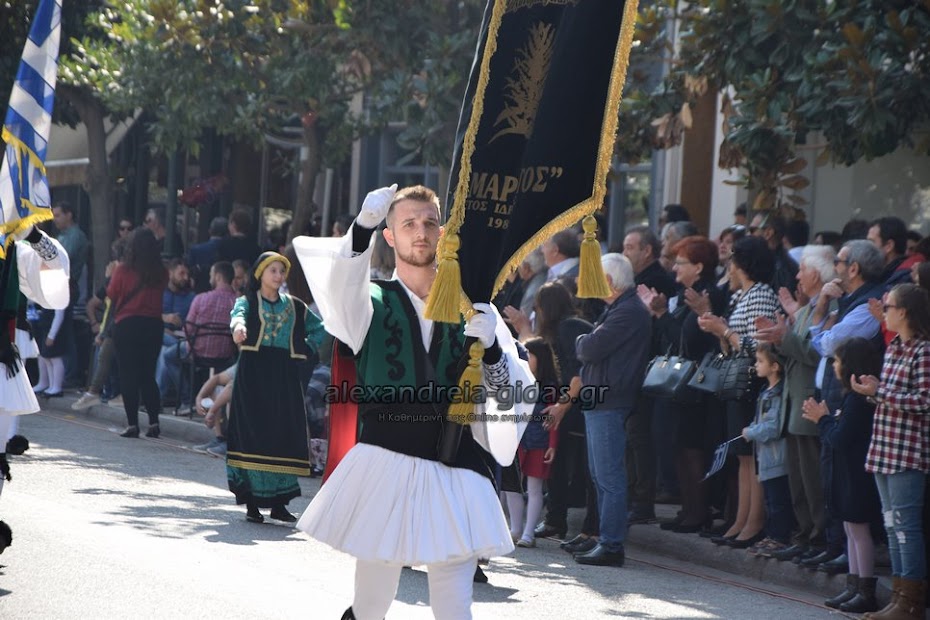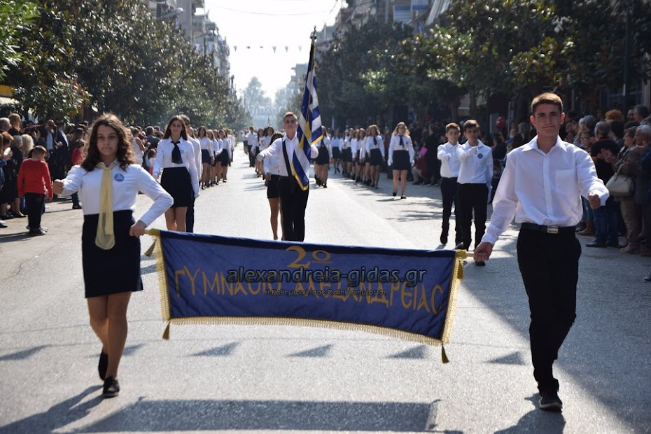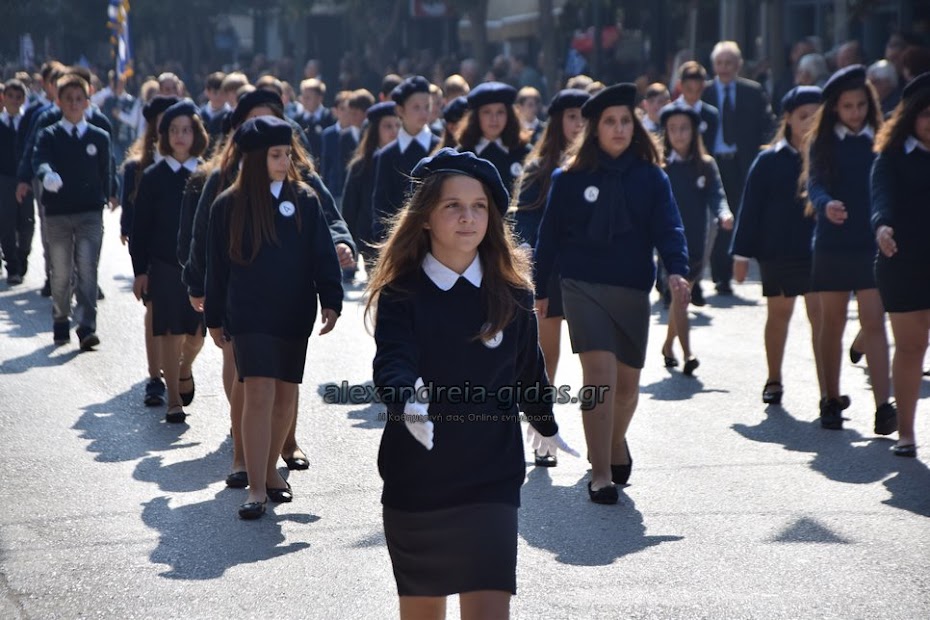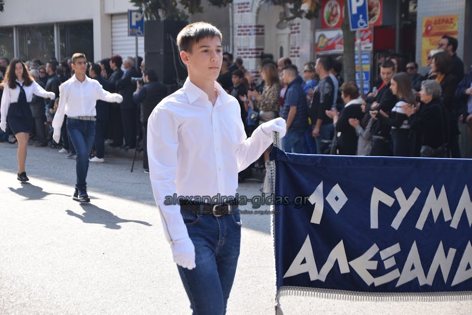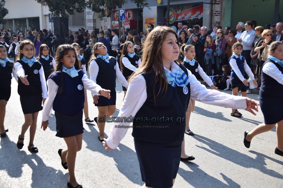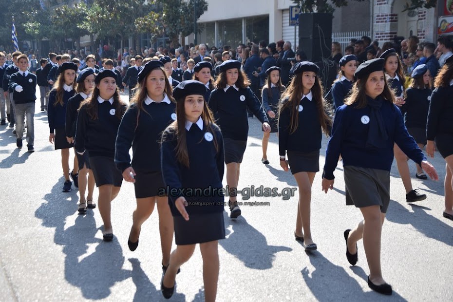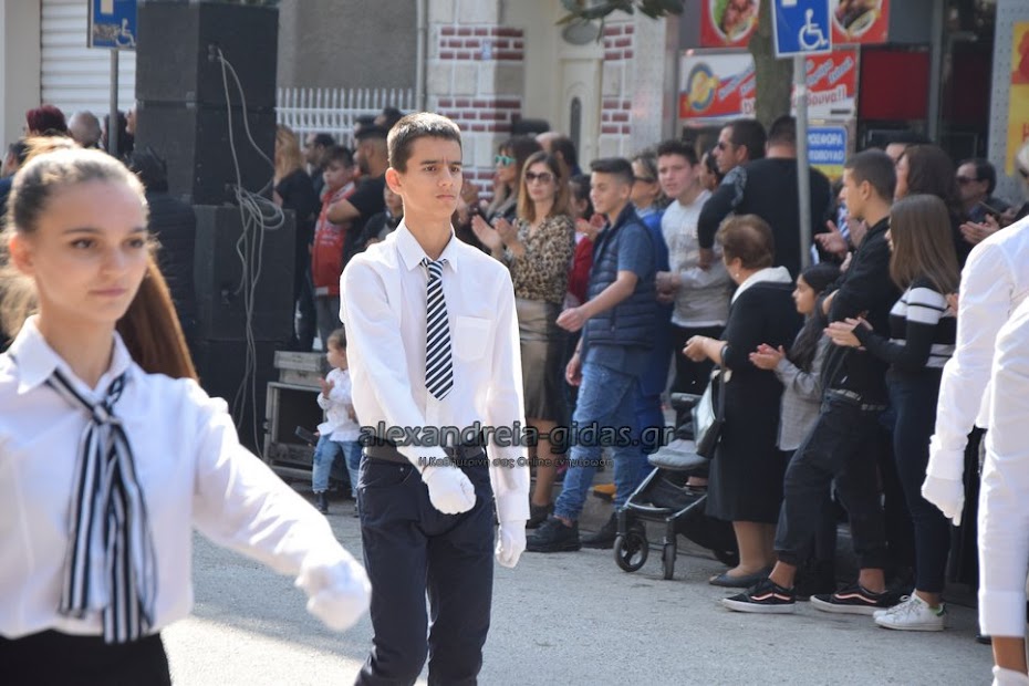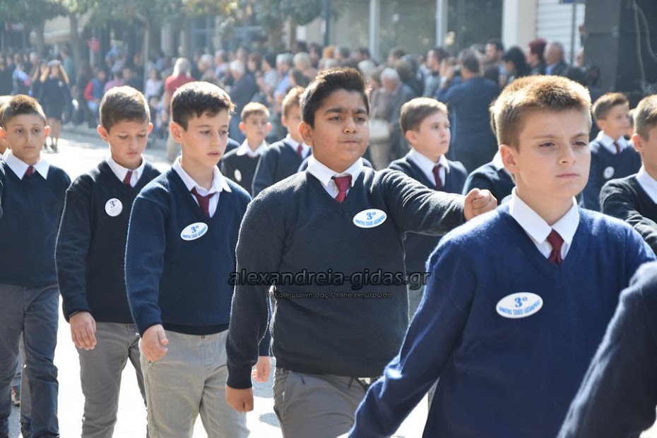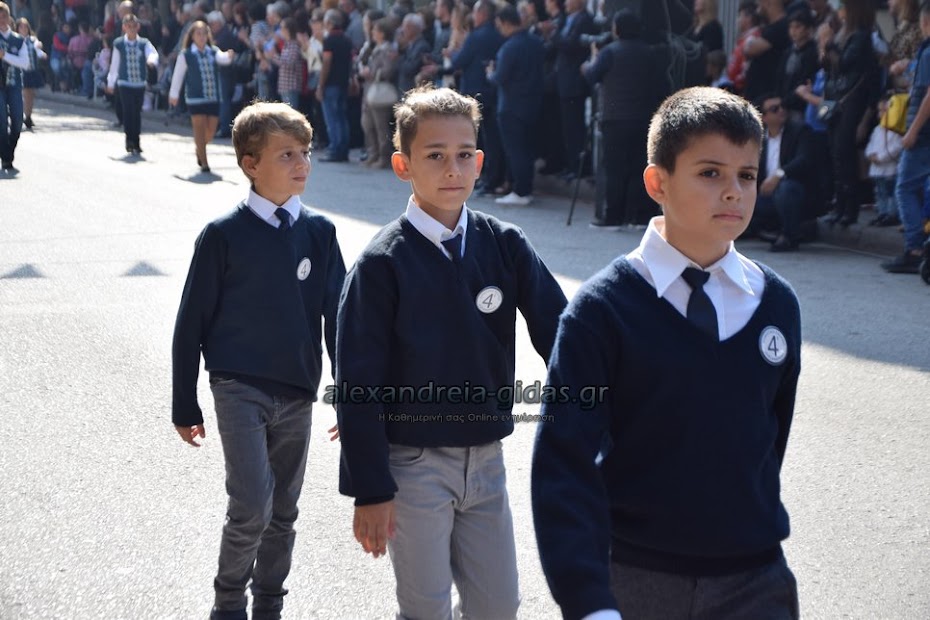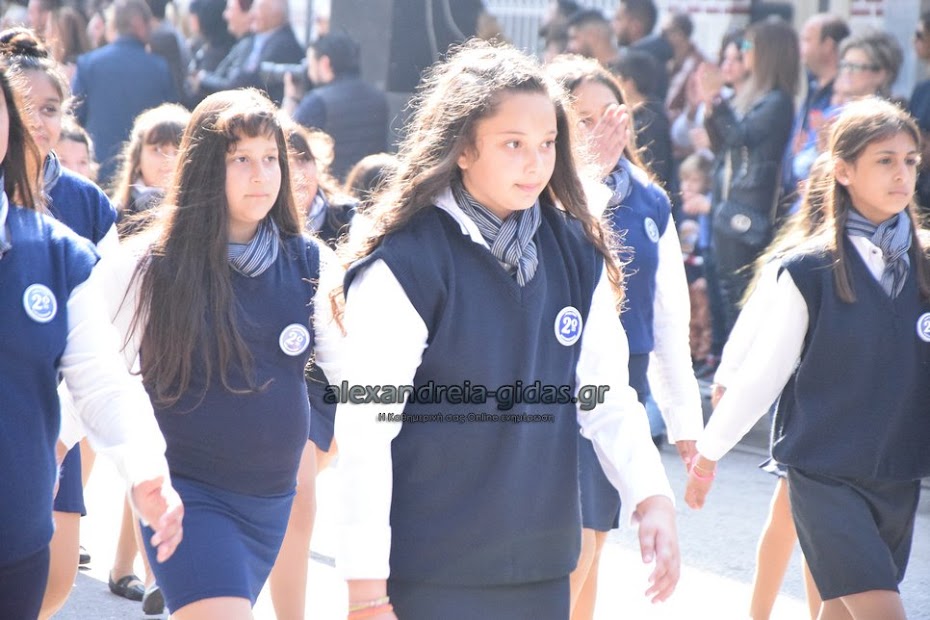 Το θερμό χειροκρότημα του κόσμου που συγκεντρώθηκε στο κέντρο της πόλης απέσπασαν τα σχολεία, οι πολιτιστικοί και αθλητικοί σύλλογοι, οι Πρόσκοποι Αλεξάνδρειας και ο στρατός που παρέλασαν στην Βετσοπούλου.