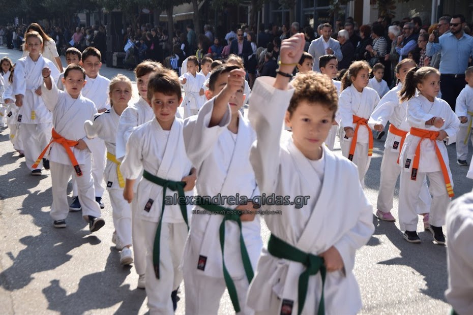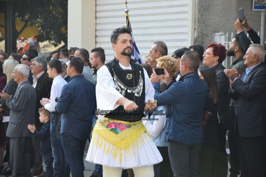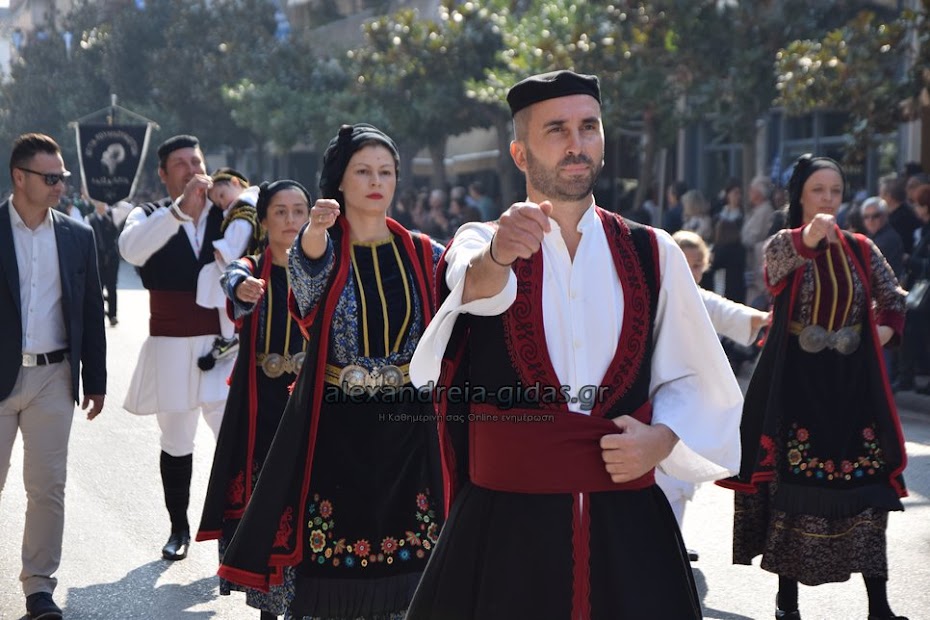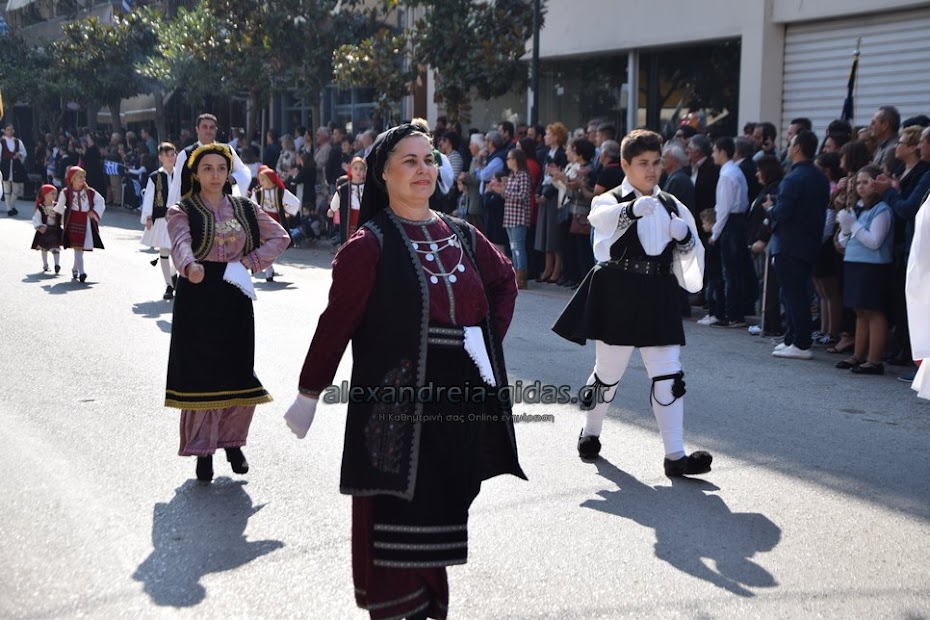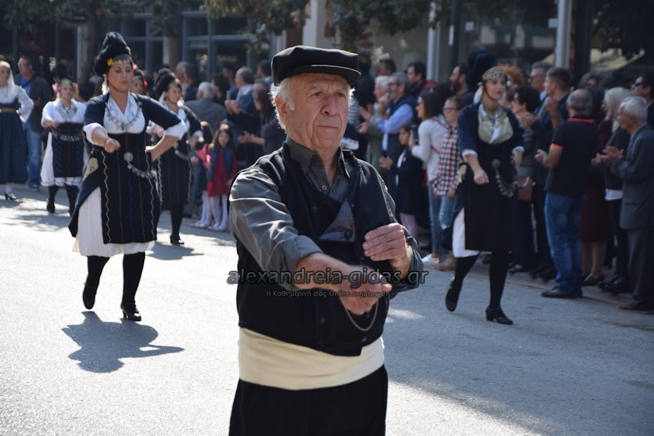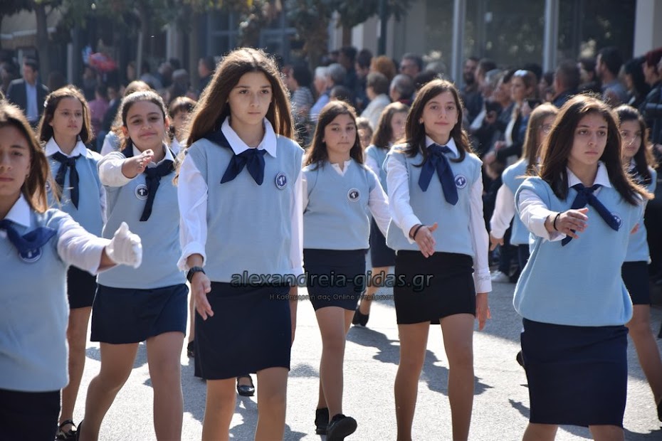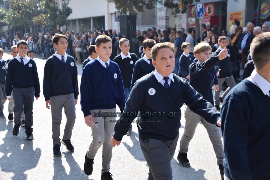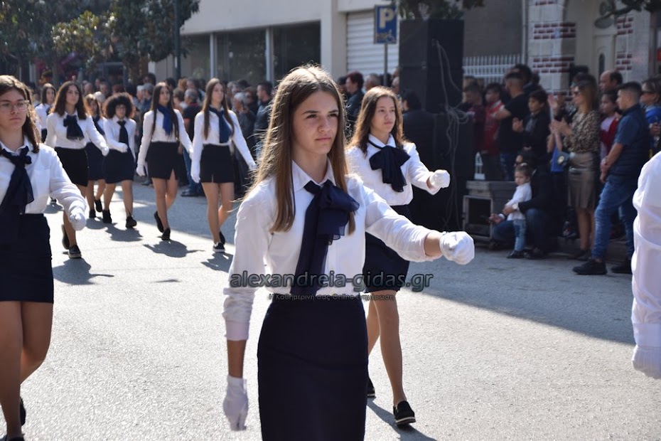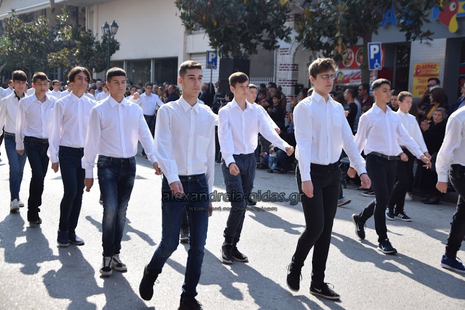 Το θερμό χειροκρότημα του κόσμου που συγκεντρώθηκε στο κέντρο της πόλης απέσπασαν τα σχολεία, οι πολιτιστικοί και αθλητικοί σύλλογοι, οι Πρόσκοποι Αλεξάνδρειας και ο στρατός που παρέλασαν στην Βετσοπούλου.