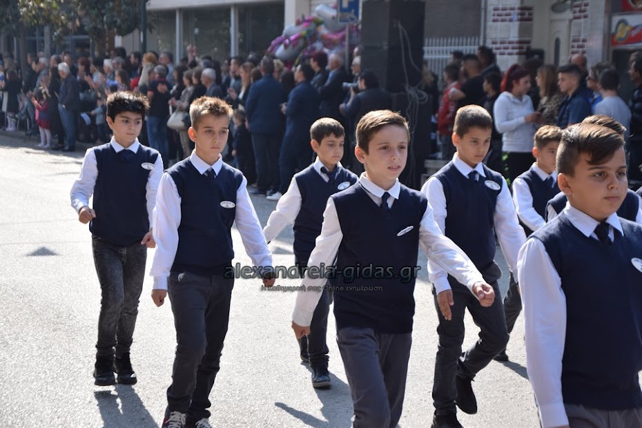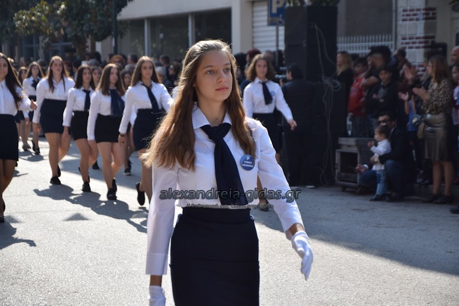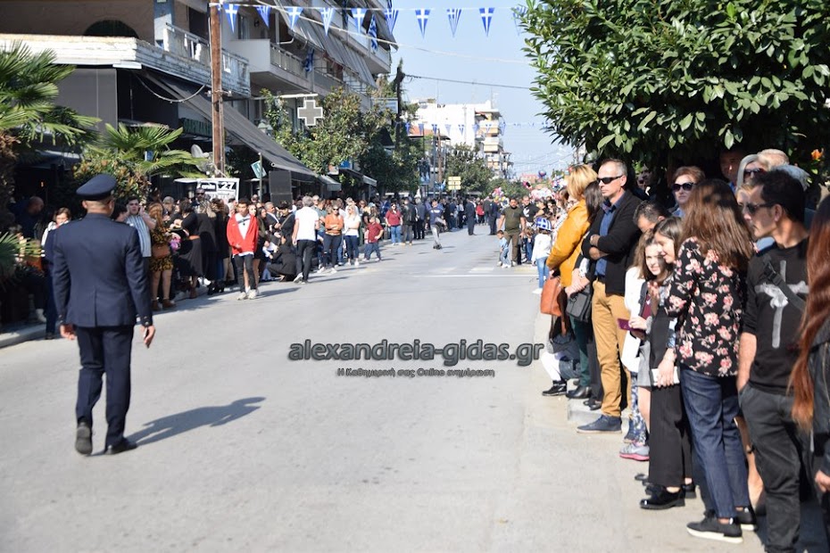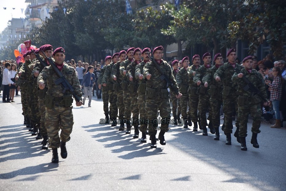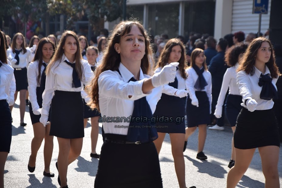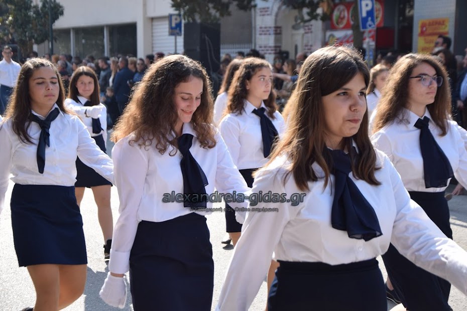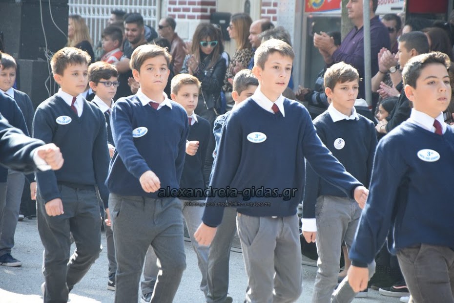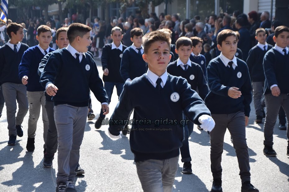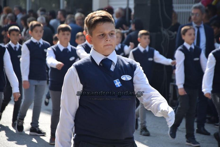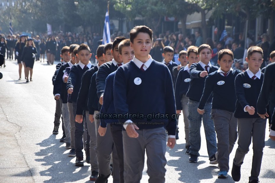 Το θερμό χειροκρότημα του κόσμου που συγκεντρώθηκε στο κέντρο της πόλης απέσπασαν τα σχολεία, οι πολιτιστικοί και αθλητικοί σύλλογοι, οι Πρόσκοποι Αλεξάνδρειας και ο στρατός που παρέλασαν στην Βετσοπούλου.