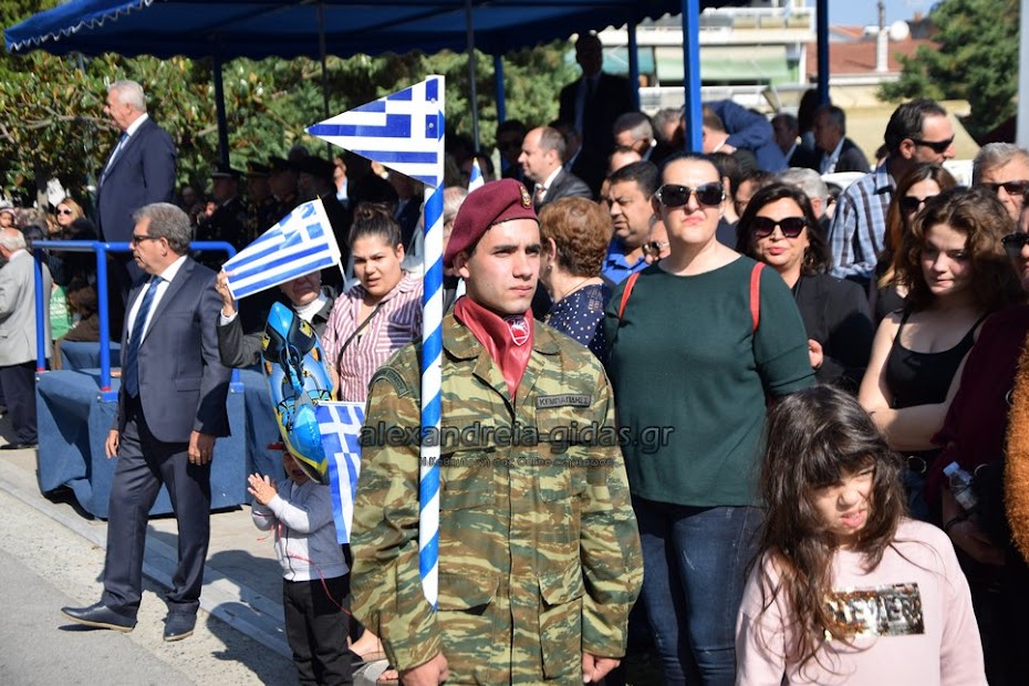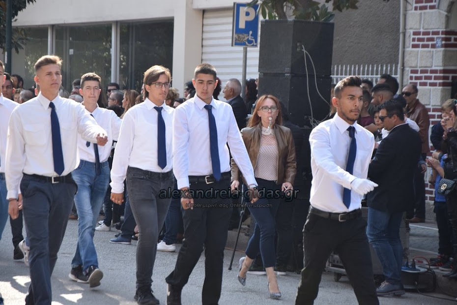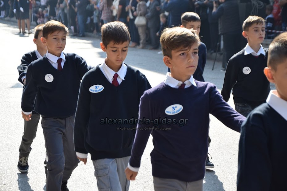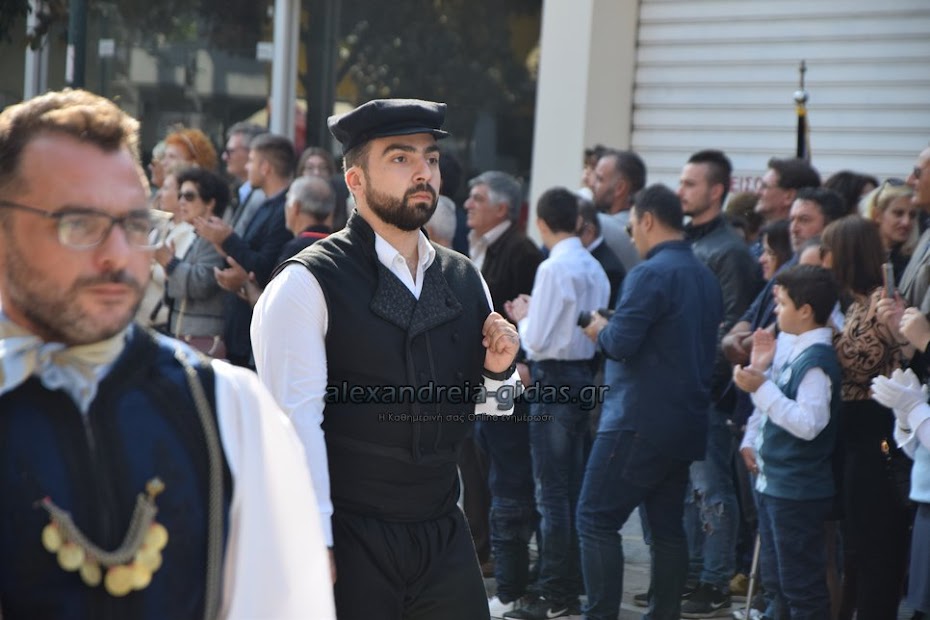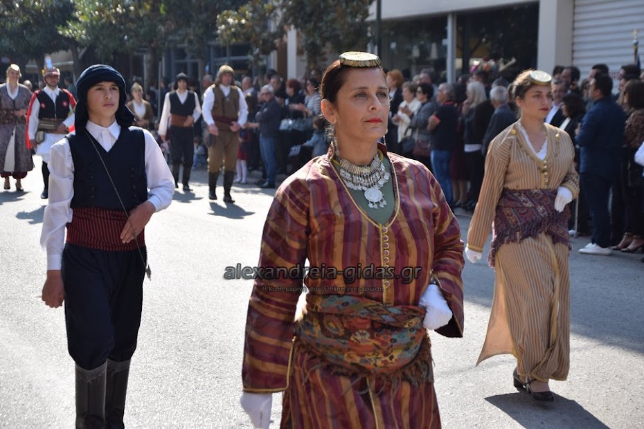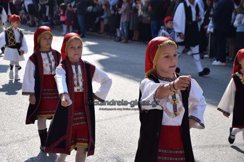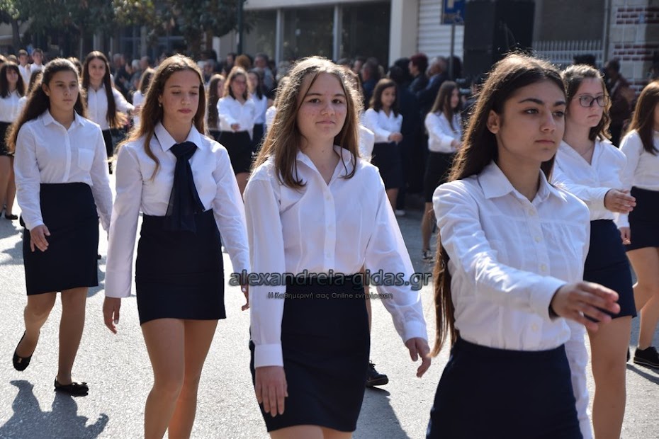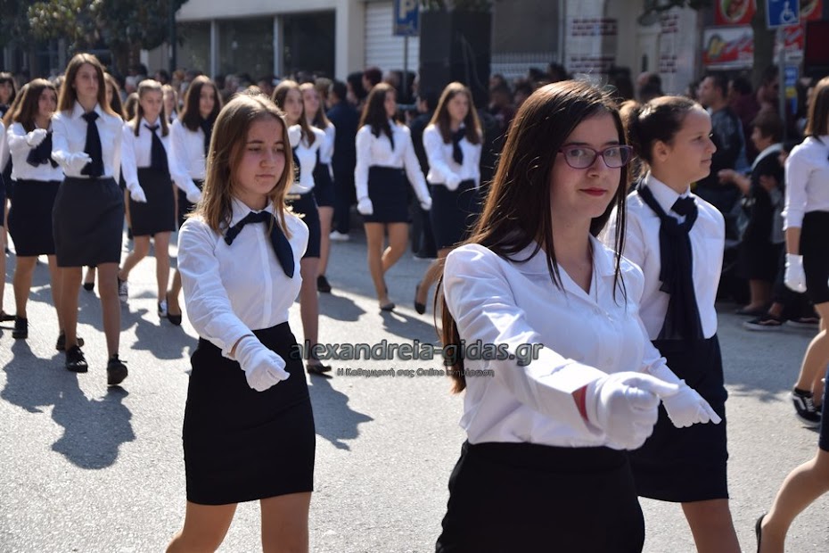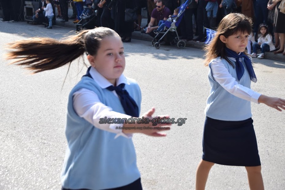 Το θερμό χειροκρότημα του κόσμου που συγκεντρώθηκε στο κέντρο της πόλης απέσπασαν τα σχολεία, οι πολιτιστικοί και αθλητικοί σύλλογοι, οι Πρόσκοποι Αλεξάνδρειας και ο στρατός που παρέλασαν στην Βετσοπούλου.