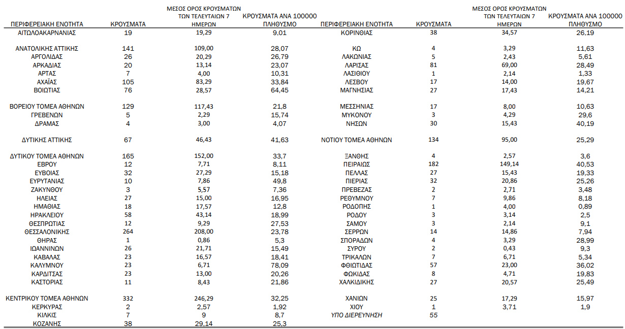 Με βάση τα επιβεβαιωμένα κρούσματα των τελευταίων 7 ημερών, 57 θεωρούνται σχετιζόμενα με ταξίδι από το εξωτερικό και 2.082 είναι σχετιζόμενα με ήδη γνωστό κρούσμα.