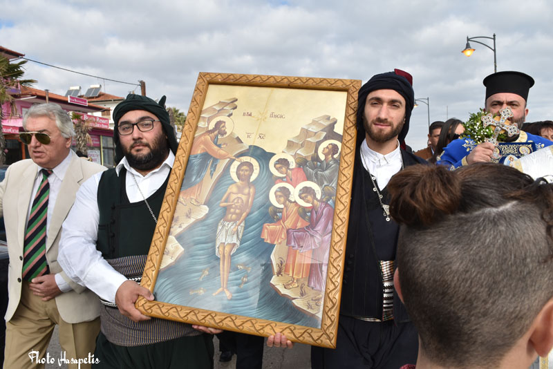 Πλήθος κόσμου από όλη την περιοχή παρακολούθησε την τελετή καθαγιασμού των υδάτων στο Μακρύγιαλο Πιερίας, στην παραλία του χωριού, με τα καπνογόνα να δίνουν κλίμα.